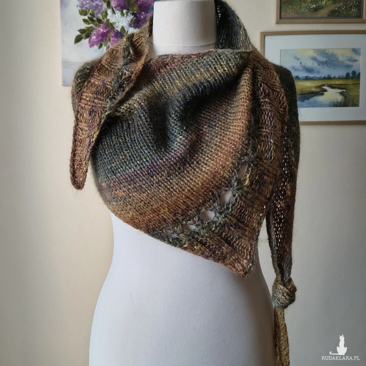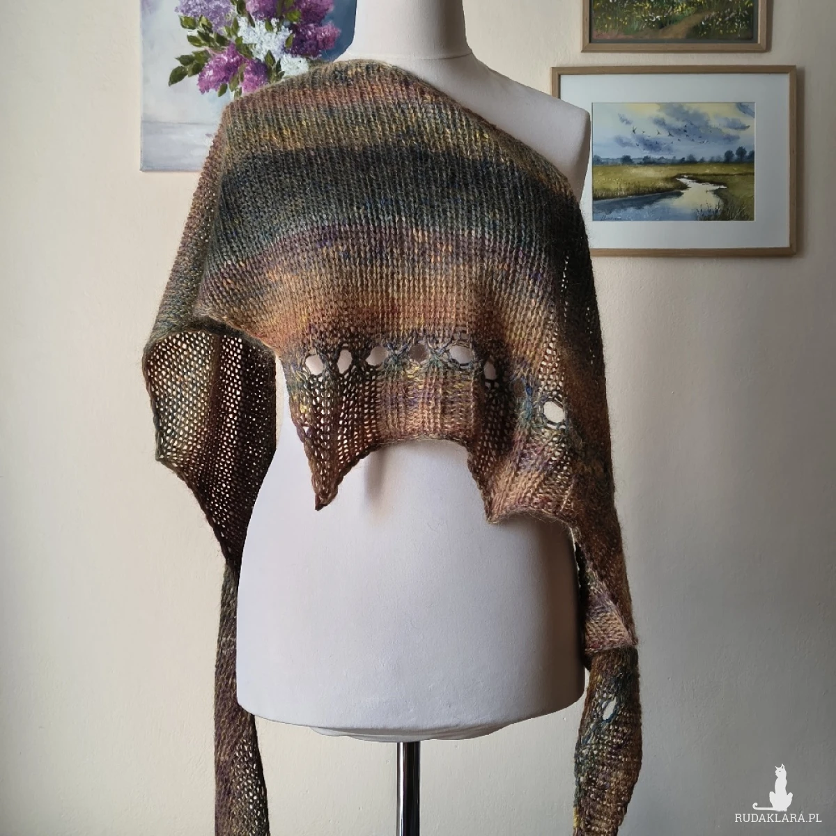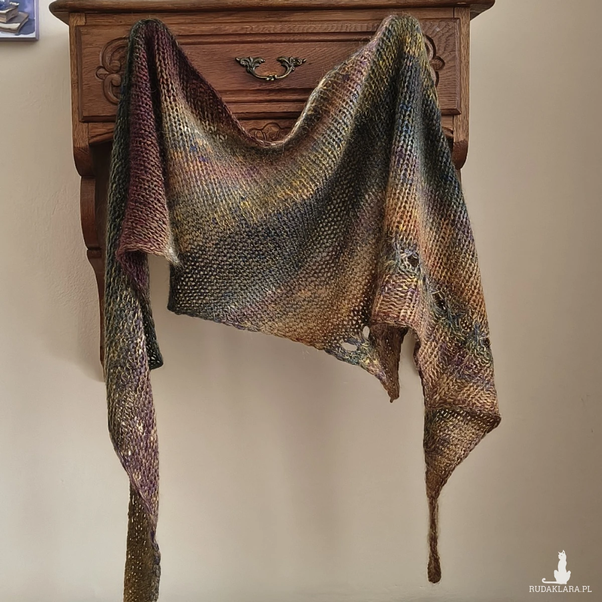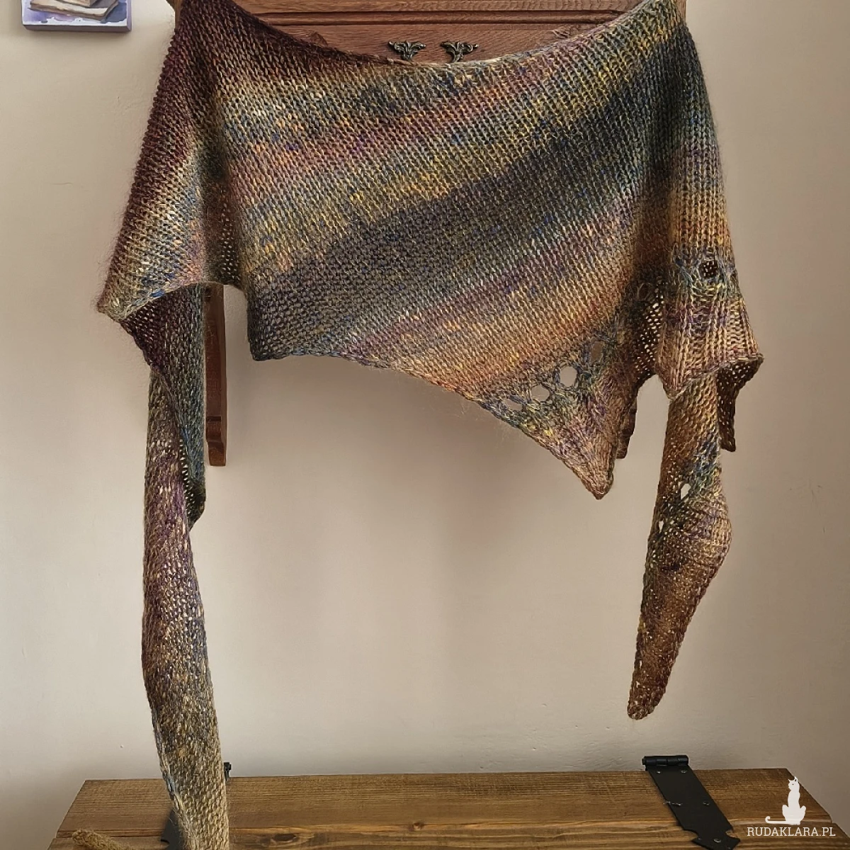 Miły, puchaty, miękki, lejący szal lub asymetryczna chusta, wykonana ręcznie na drutach podwójną nitką z doskonałych włóczek: fantastycznej włoskiej włóczki o składzie: 85% najdelikatniejszej wełenki virgin wool i 15% poliamidu, a także kanadyjskiej szlachetnej włóczki, będącej mieszanką szlachetnego jedwabiu 30% z moherem 70%. Niestety zdjęcia nie oddają piękna kolorów ich gradientów, uroku i miękkości włóczek. Są to przepiękne jesienne tonacje. Szal/chusta jest twarzowa, ciepła i pasuje do wielu stylizacji. Wymiary: długość 242 cm., w najszerszym miejscu 52 cm. Doda uroku każdej stylizacji niezależnie od pory roku. Pranie wyłącznie ręczne.