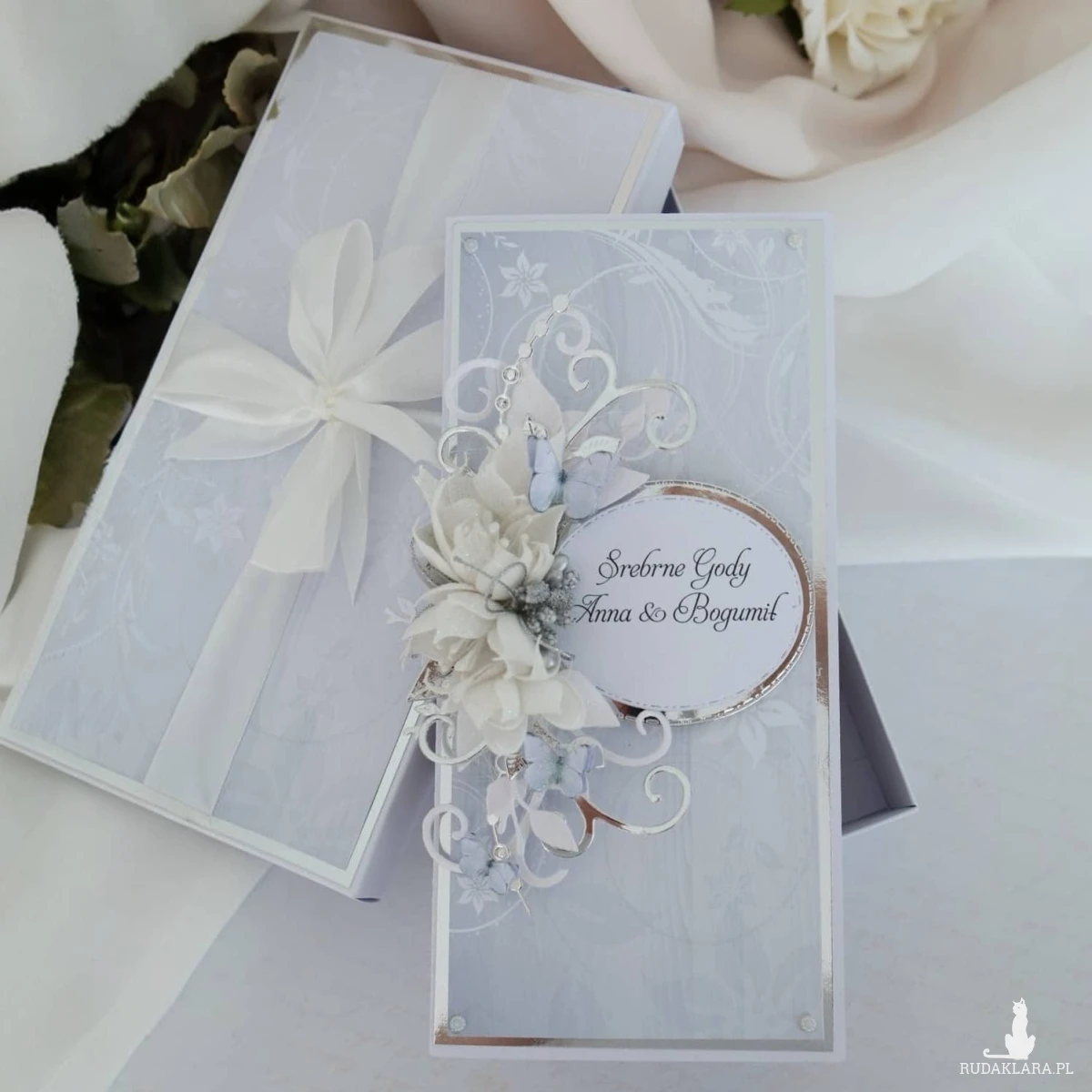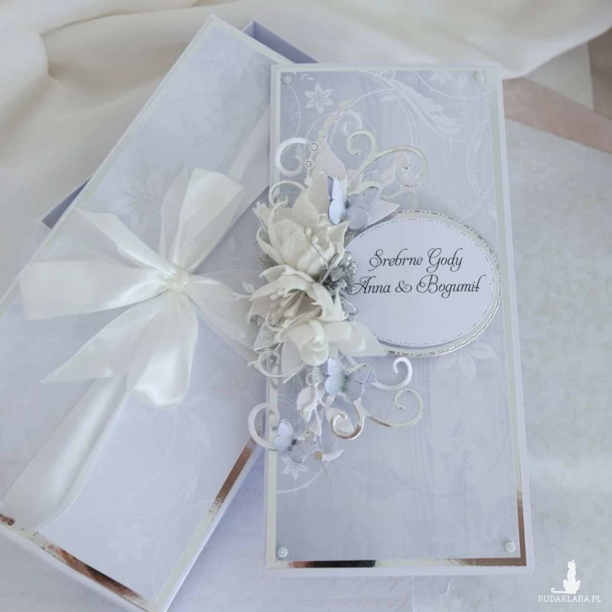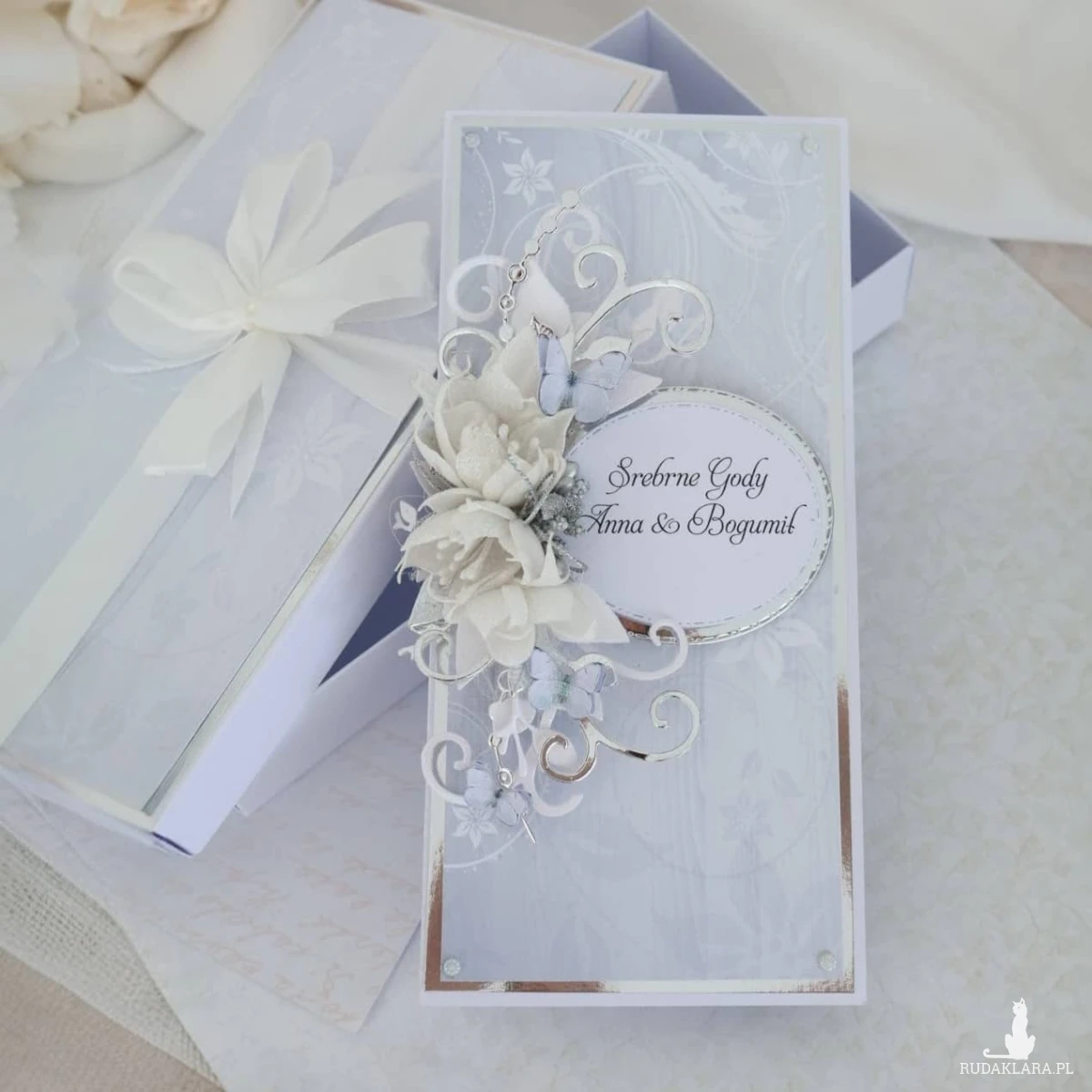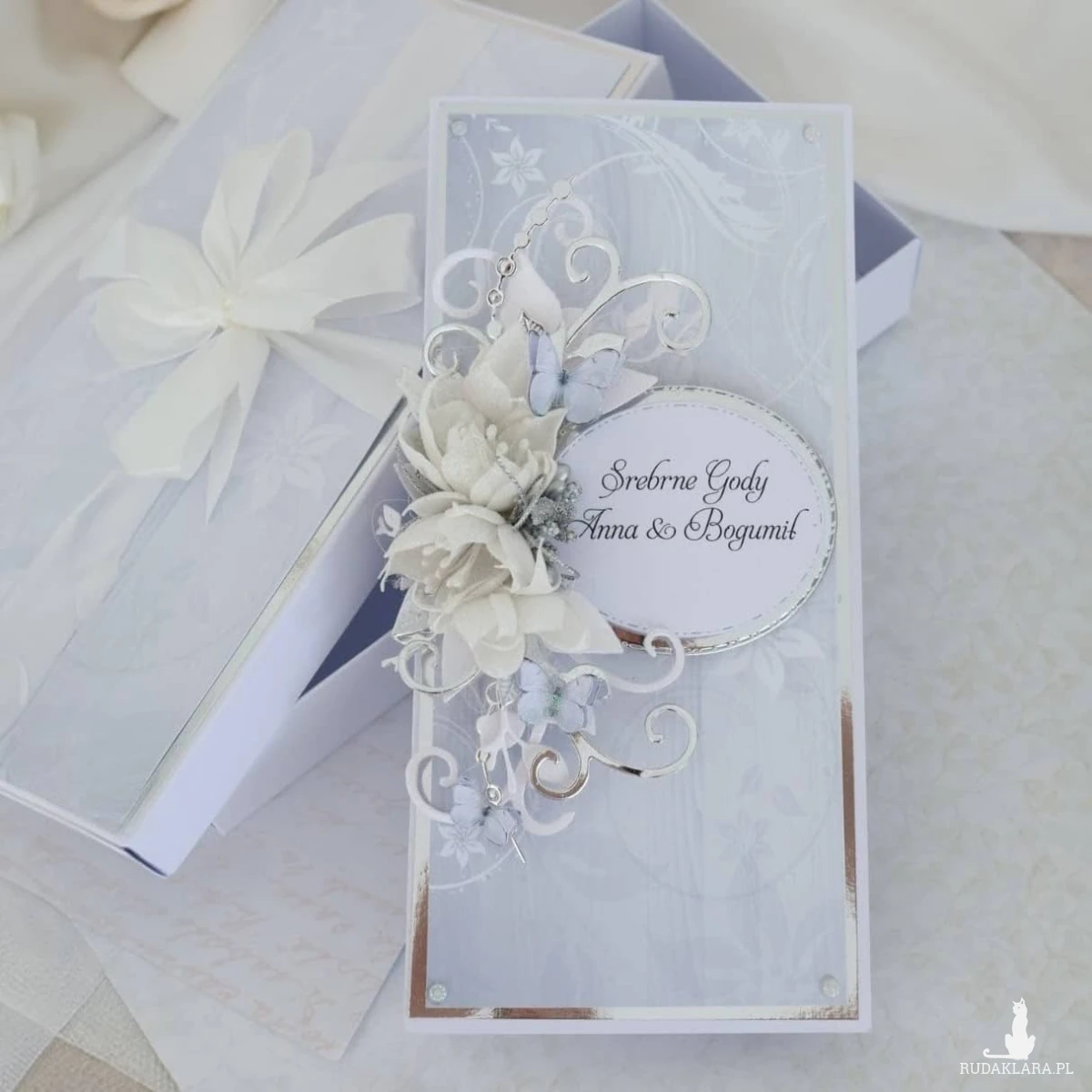 Personalizowana kartka na 25 rocznicę ślubu w eleganckim pudełku to piękny sposób na przekazanie życzeń i wręczenie wyjątkowego prezentu Jubilatom.