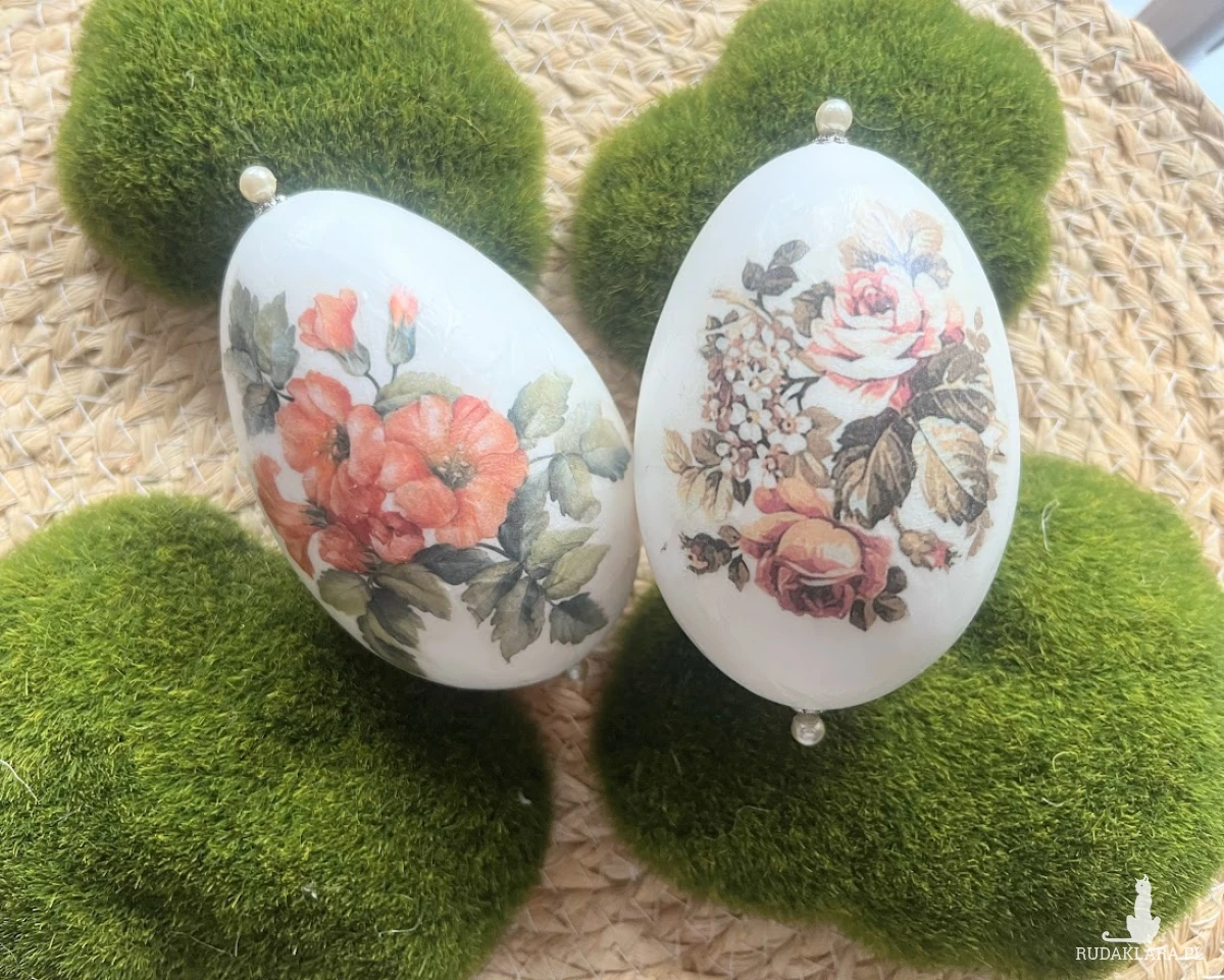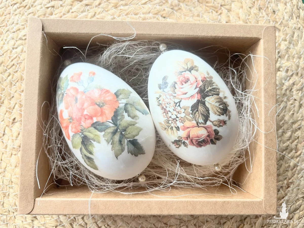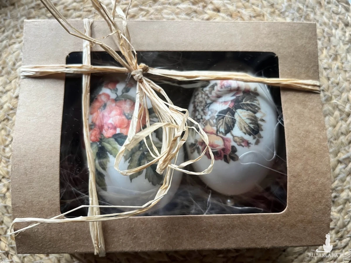 Niezwykle oryginalna dekoracja wielkanocna w formie pisanek gęsich z motywem  kwiatów.. Komplet stanowią 2szt. gęsich pisanek utrzymane w jednej tonacji i stylu. Będą doskonale prezentować się na wielkanocnym stole, w wazonie wśród  gałązek wierzby czy też w wielkanocnym koszyku.Pisanki zostały zapakowane w piękne pudełko z okienkiem na sizalu .Wymiary pudełka 17x13x5,5.Pudełko przewiązane naturalnym sizalem. Ich kolorystyka wywoła uśmiech na twarzy domowników i gości.