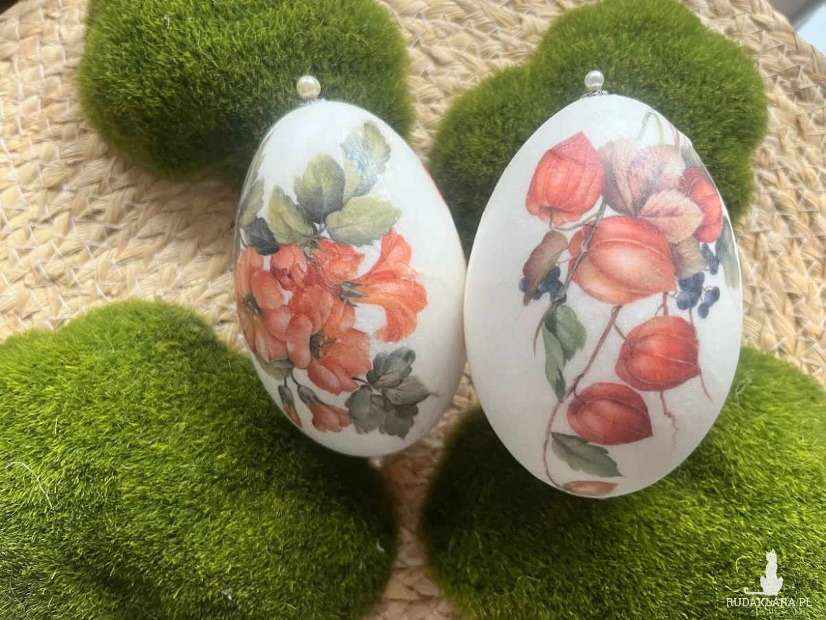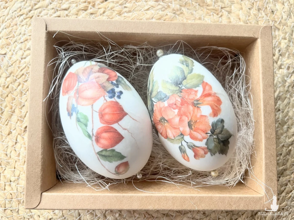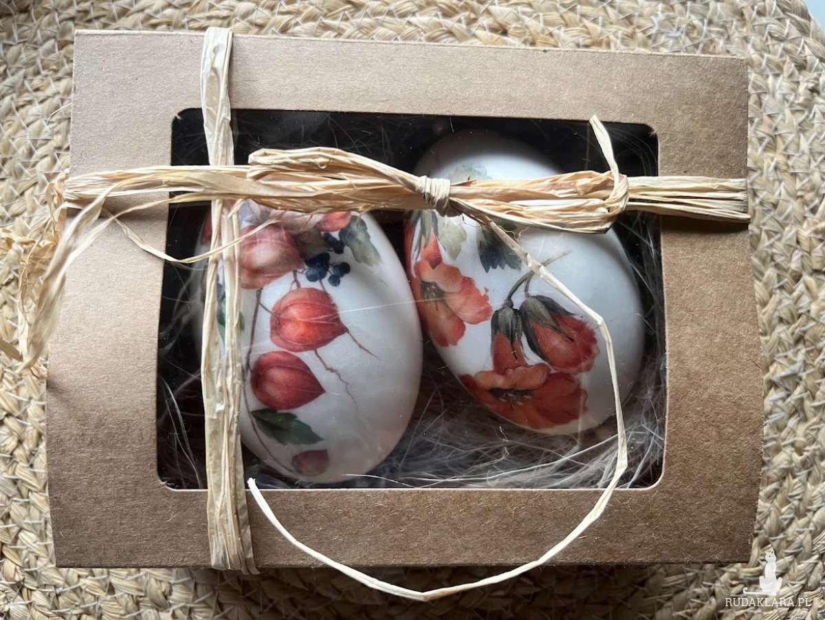 Niezwykle oryginalna dekoracja wielkanocna w formie pisanek gęsich z motywem  kwiatów.. Komplet stanowią 2szt. gęsich pisanek utrzymane w jednej tonacji i stylu. Będą doskonale prezentować się na wielkanocnym stole, w wazonie wśród  gałązek wierzby czy też w wielkanocnym koszyku.Pisanki zostały zapakowane w piękne pudełko z okienkiem na sizalu .Wymiary pudełka 17x13x5,5.Pudełko przewiązane naturalnym sizalem. Ich kolorystyka wywoła uśmiech na twarzy domowników i gości.