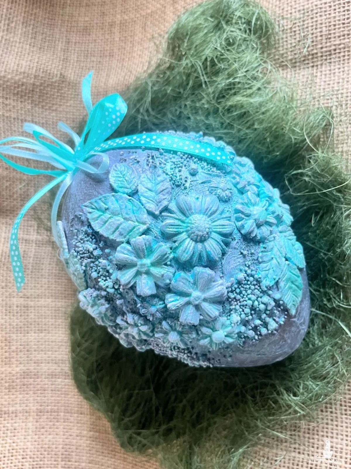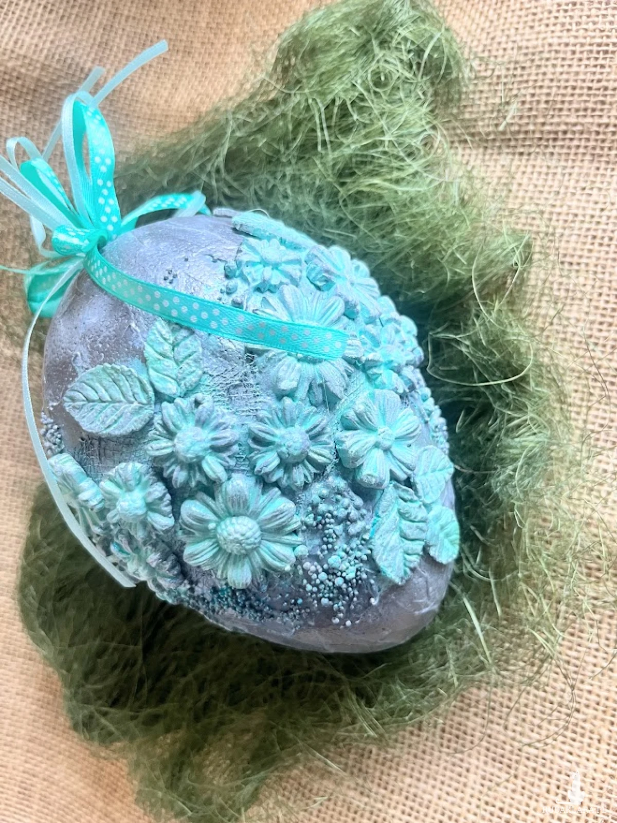 Oryginalne i bardzo efektowne jajo w kwiatach .Wykonane na formie styropianowej wys. 16 cm. Przyozdobione elementami sztukaterii kwiatowej. To propozycja dla osób, które lubią nietypowe ozdoby świąteczne. Wykonana jest w technice mixmedia i powertex, która pozwala na uzyskanie naprawdę ciekawych efektów dekoracyjnych. Jajo możesz wykorzystać do zawieszenia w oknie. Dobrze będzie prezentować się ono również na świątecznym stole zawieszone na stojaczku. W tej postaci produkt gotowy do natychmiastowej wysyłki.