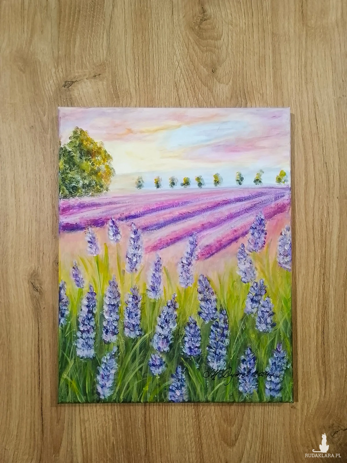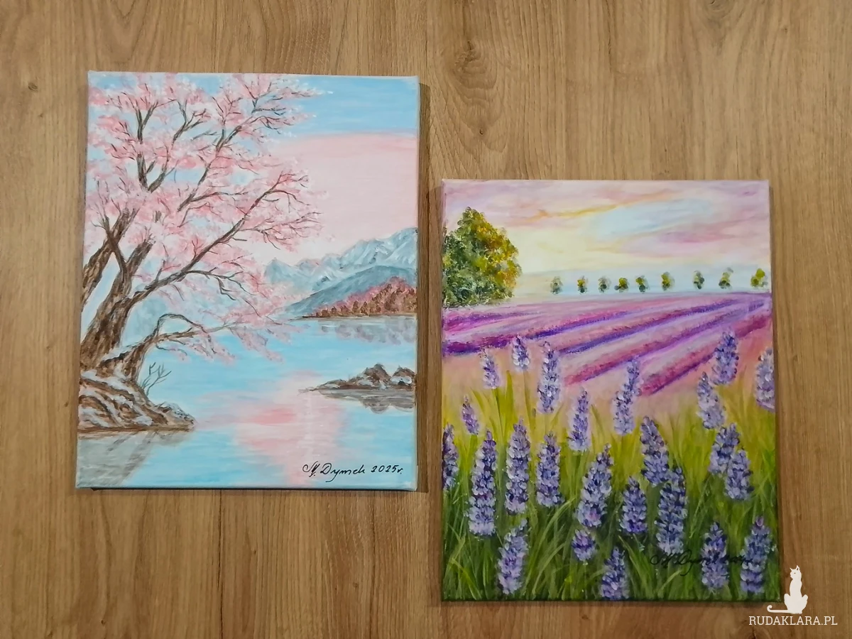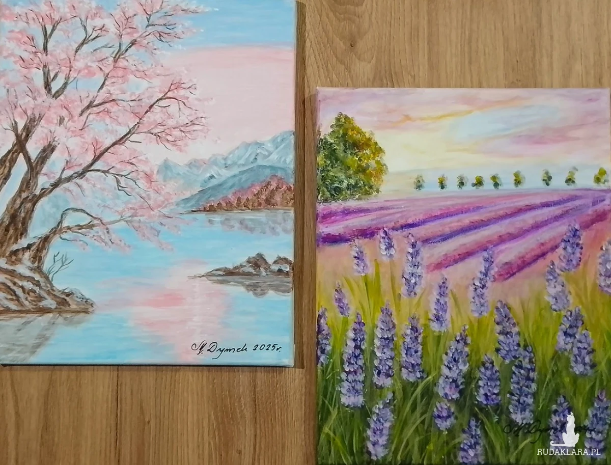 - Tematyka: Kwitnące drzewo nad taflą wody, lawendowe pole