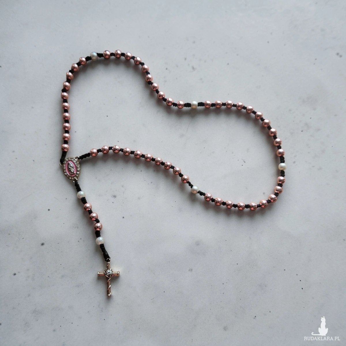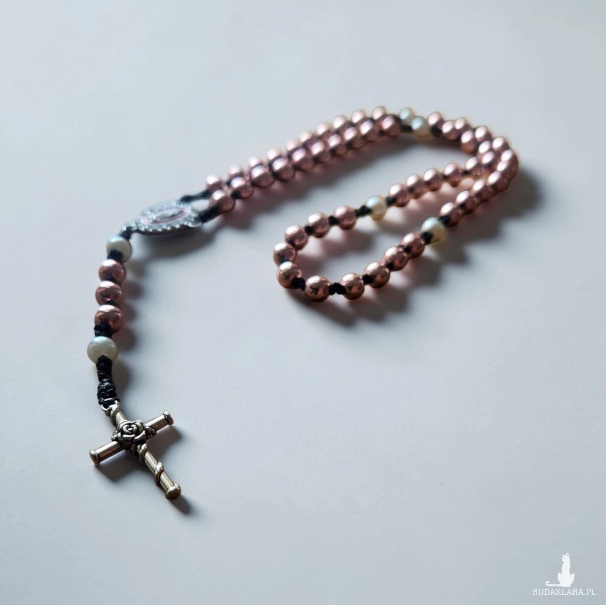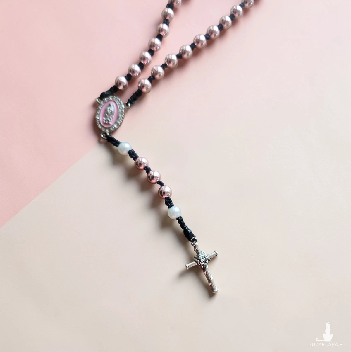 Na sprzedaż piękny różaniec wykonany z metalicznych koralików w odcieniu różowego, przeplatanych jasnymi perełkami. Całość osadzona na solidnym, czarnym sznurku, co zapewnia trwałość i wygodę użytkowania. Zwieńczony ozdobnym krzyżykiem oraz subtelnym medalikiem.