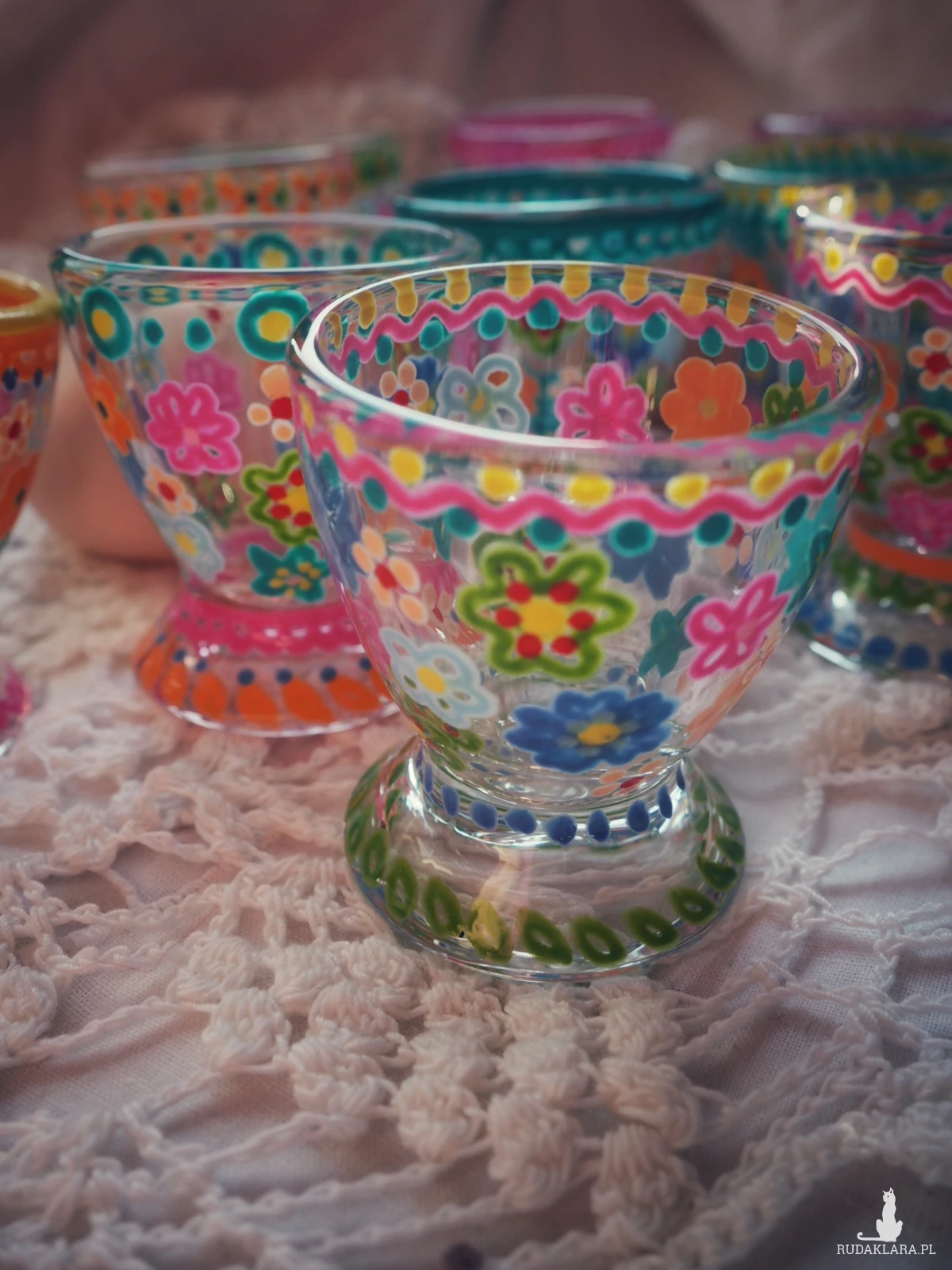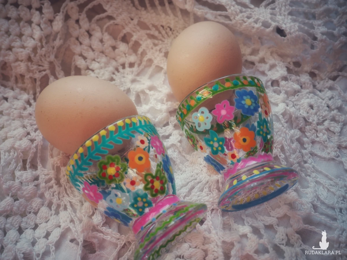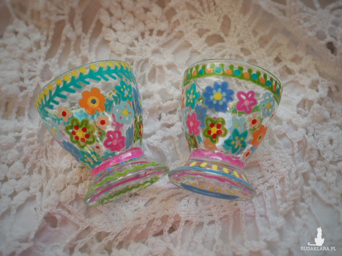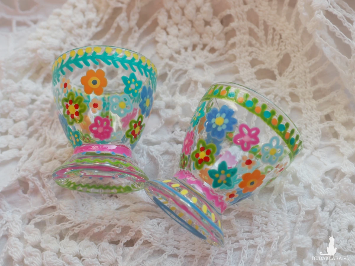 Ręcznie malowane kieliszki do jajek to wyjątkowy dodatek, który wprowadzi kolor do każdego śniadania. Żywe barwy sprawdzą się doskonale na co dzień i od święta, a kwiatowy wzór to uniwersalny rozweselacz stołu. Każdy kieliszek jest inny, jedyny w swoim rodzaju.