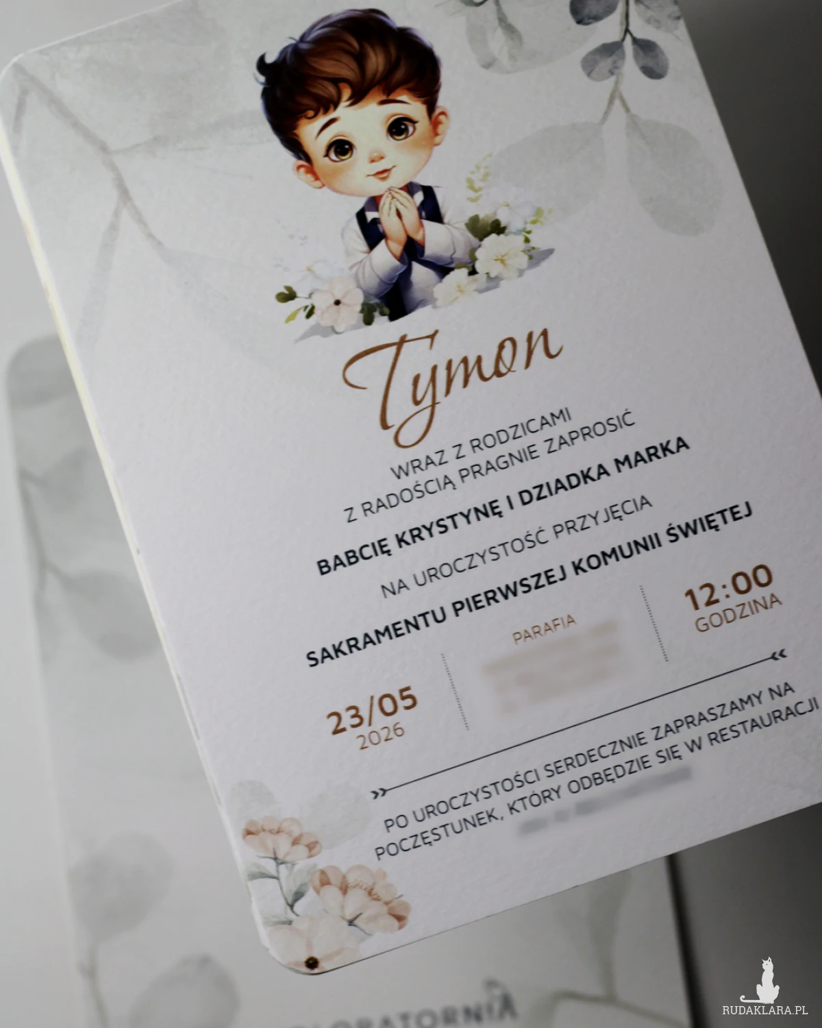 Format zaproszenia 12x17cm. Wydruk dwustronny na papierze ozdobnym o gramaturze 250g o delikatnej fakturze.