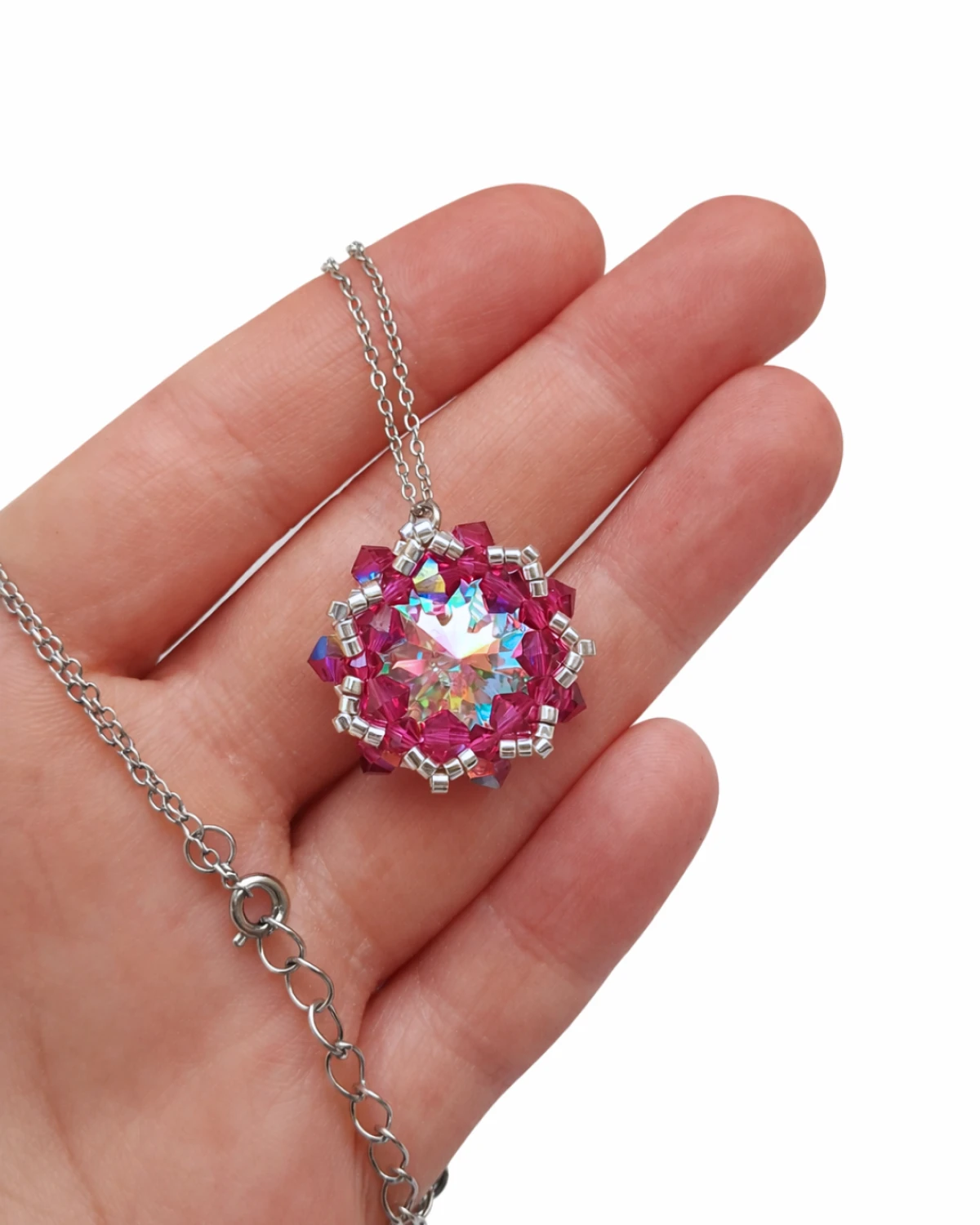 Preciosa to renomowana europejska marka specjalizująca się w produkcji kryształów i kamieni jubilerskich o najwyższej jakości szlifu i blasku, cenionych za czystość i intensywność efektu świetlnego. Kamień otoczony został kryształkami Preciosa Bicone oraz koralikami Miyuki Delica, znanymi z jubilerskiej precyzji i idealnej regularności.
