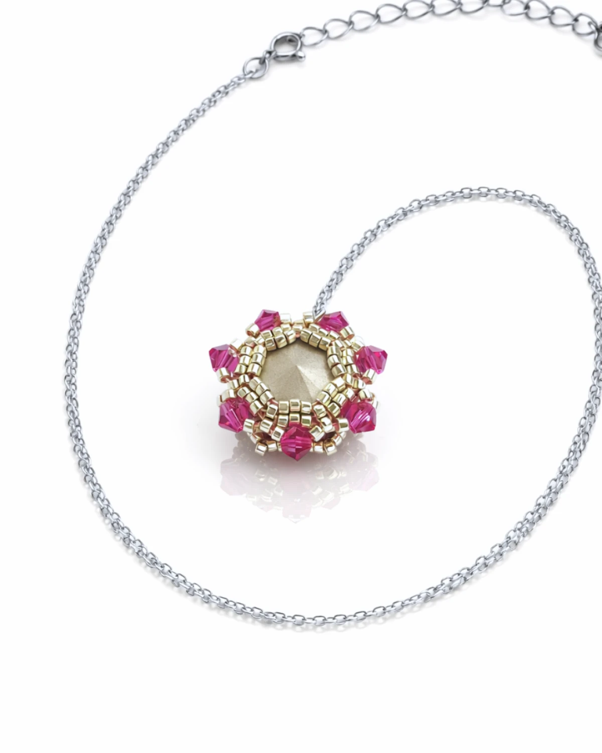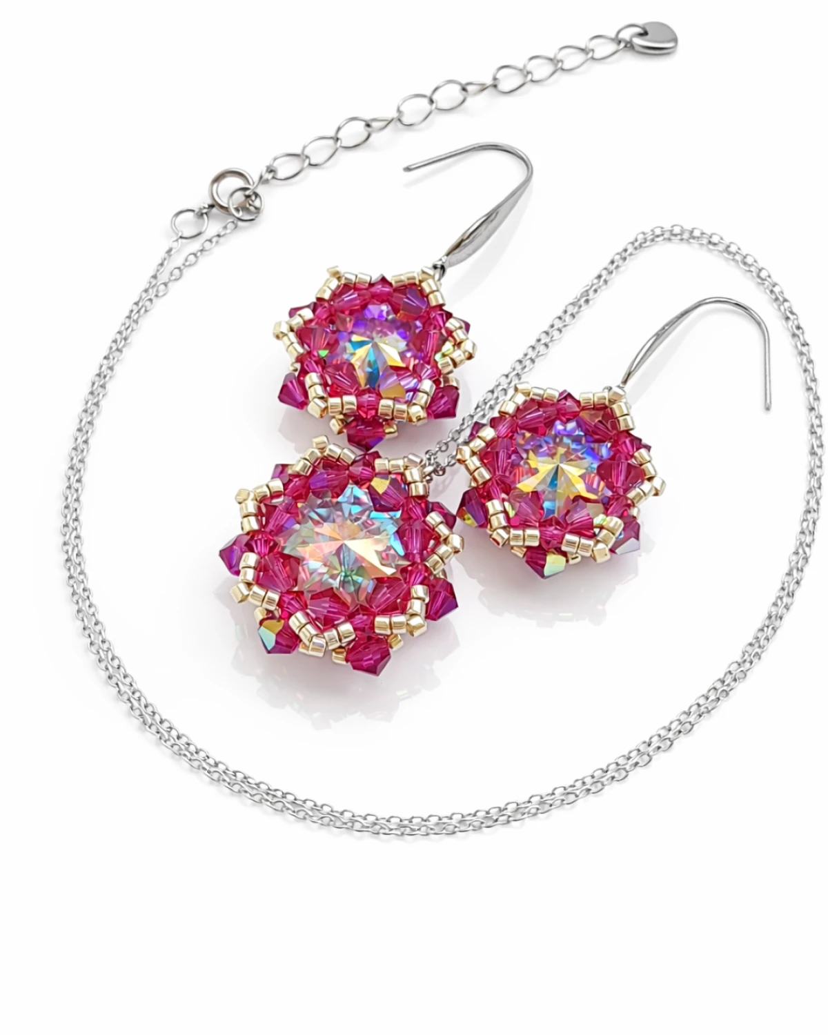 Zestaw Crystal Maxima - Fuchsia składa się z kolczyków oraz naszyjnika, tworzących spójną, harmonijną całość. Centralnym punktem biżuterii są kamienie Preciosa Rivoli Maxima w kolorze Crystal AB, otulone misterną oprawą z drobnych koralików Miyuki Delica oraz kryształków Preciosa Bicone w odcieniu Fuchsia. Ręczne tkanie pozwala uzyskać lekką, a jednocześnie trwałą konstrukcję, w której każdy detal ma znaczenie.