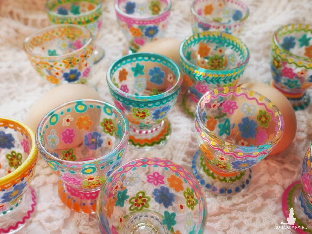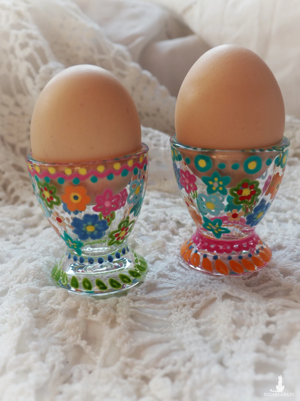 Ręcznie malowane kieliszki do jajek to wyjątkowy dodatek, który wprowadzi kolor do każdego śniadania. Żywe barwy sprawdzą się doskonale na co dzień i od święta, a kwiatowy wzór to uniwersalny rozweselacz stołu. Każdy kieliszek jest inny, jedyny w swoim rodzaju.