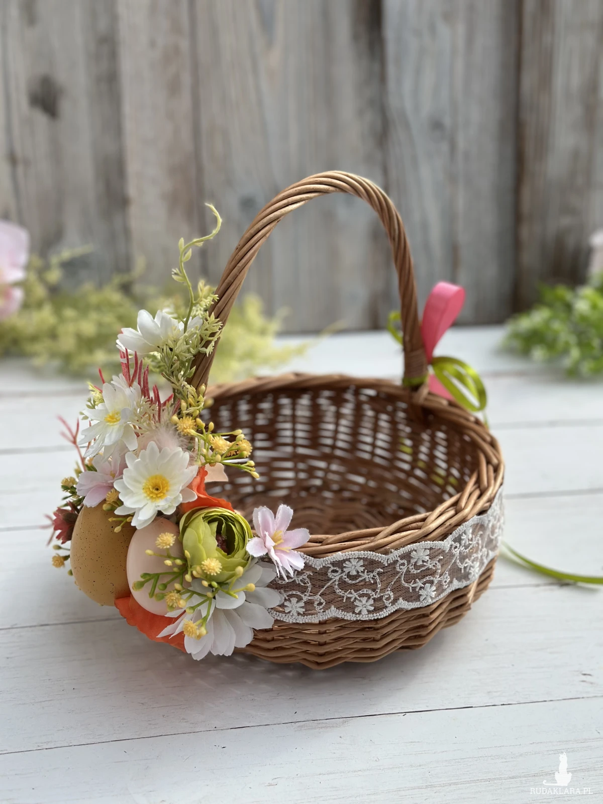 Koszyczek wielkanocny z naturalnej wikliny, ozdobiony kwiatami i dodatkami sztucznymi. Dekoracja na stałe przymocowana do koszyczka, przygotowana przeze mnie ręcznie :)