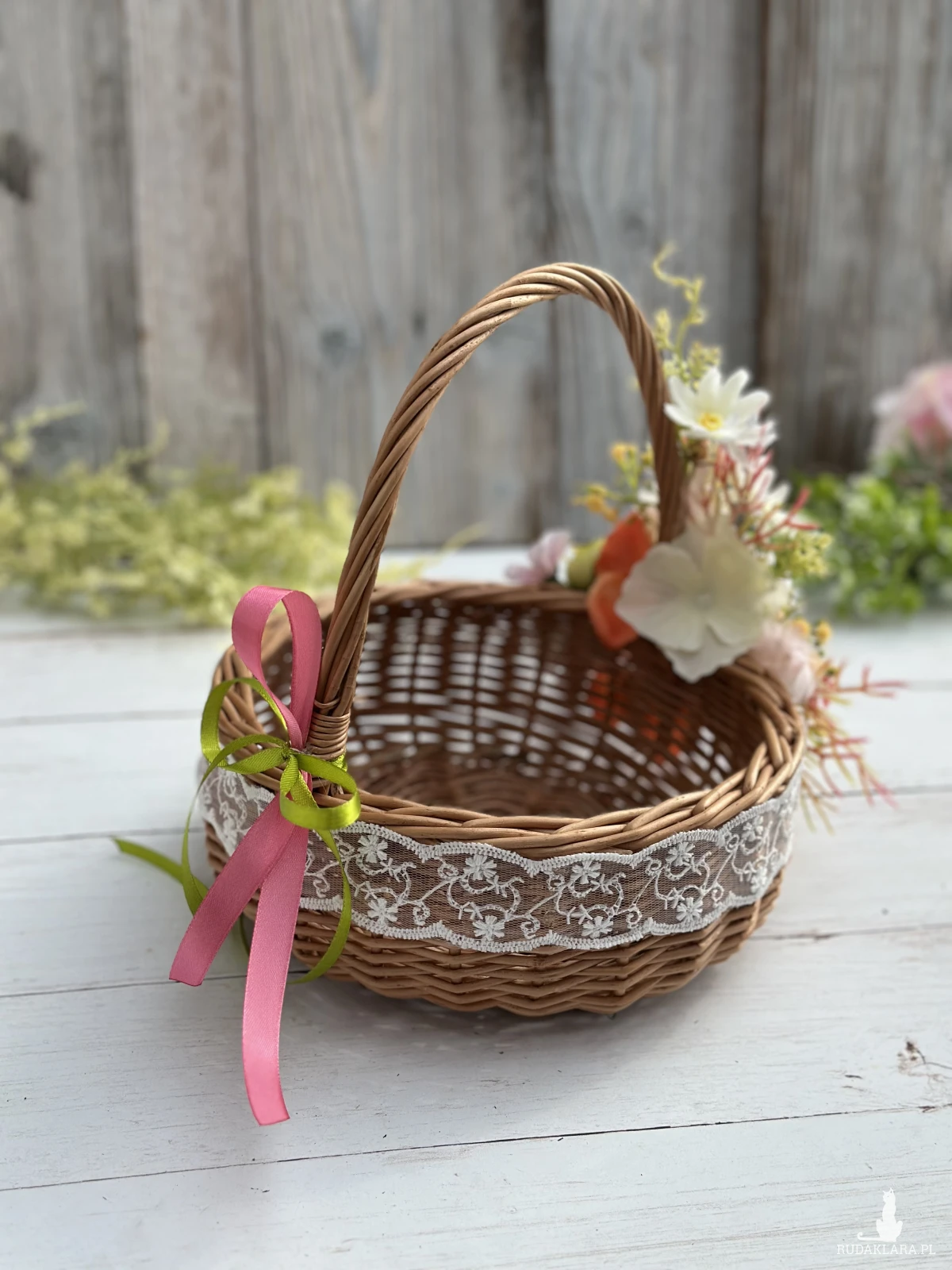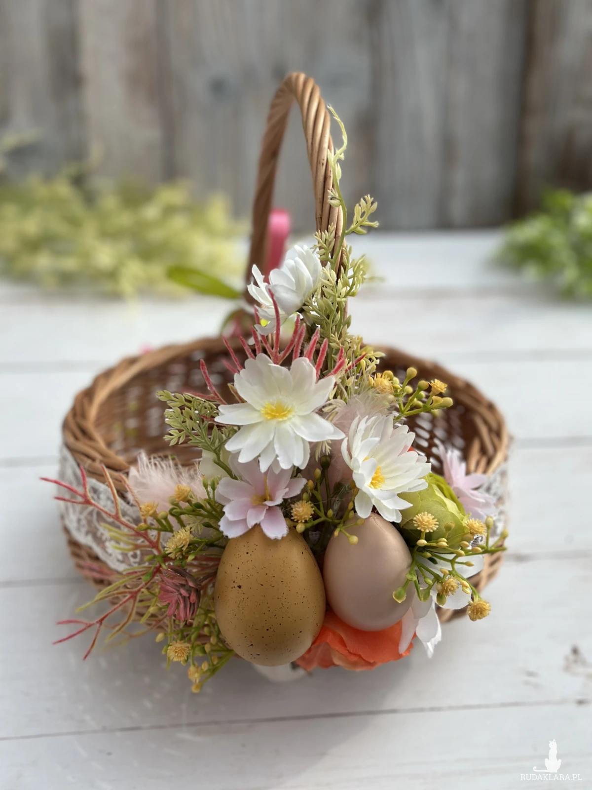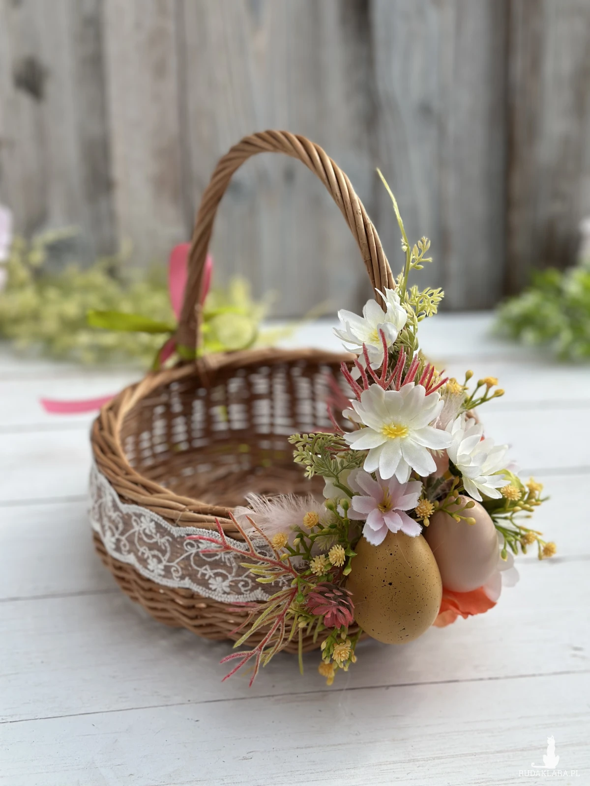 Koszyczek wielkanocny z dekoracją, koszyk wiklinowy