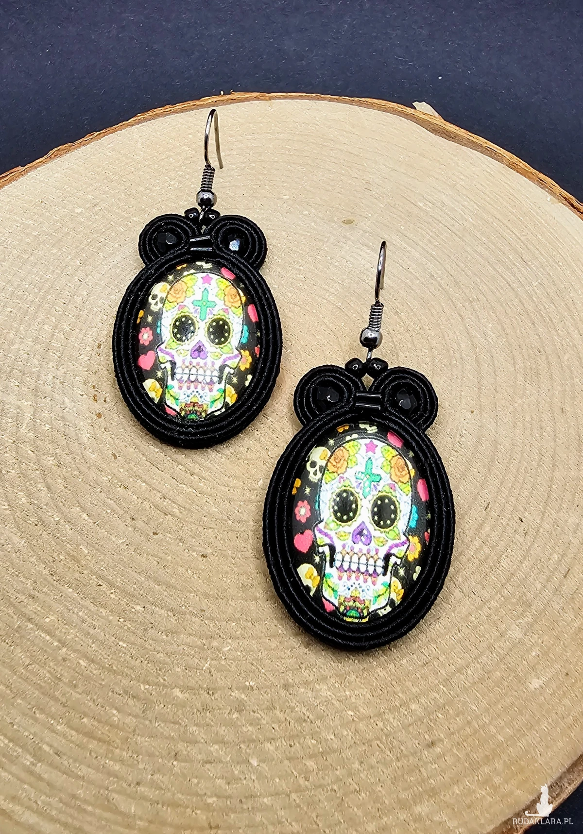 Szklane owalne kaboszony z grafiką czaszki otoczone sznurkami sutasz oraz szklanymi czeskimi koralikami. Kolczyki zawieszsone na metalowych otwartych biglach w kolorze ciemnego srebra.