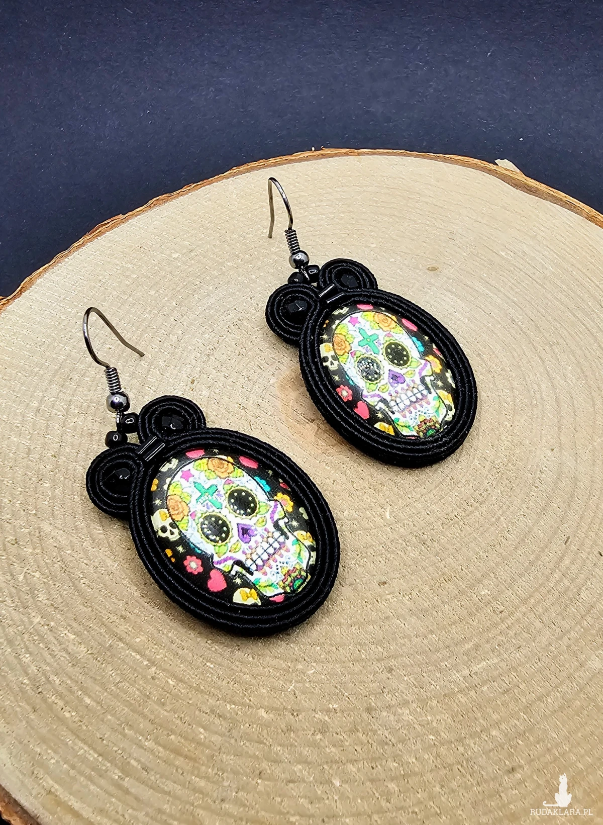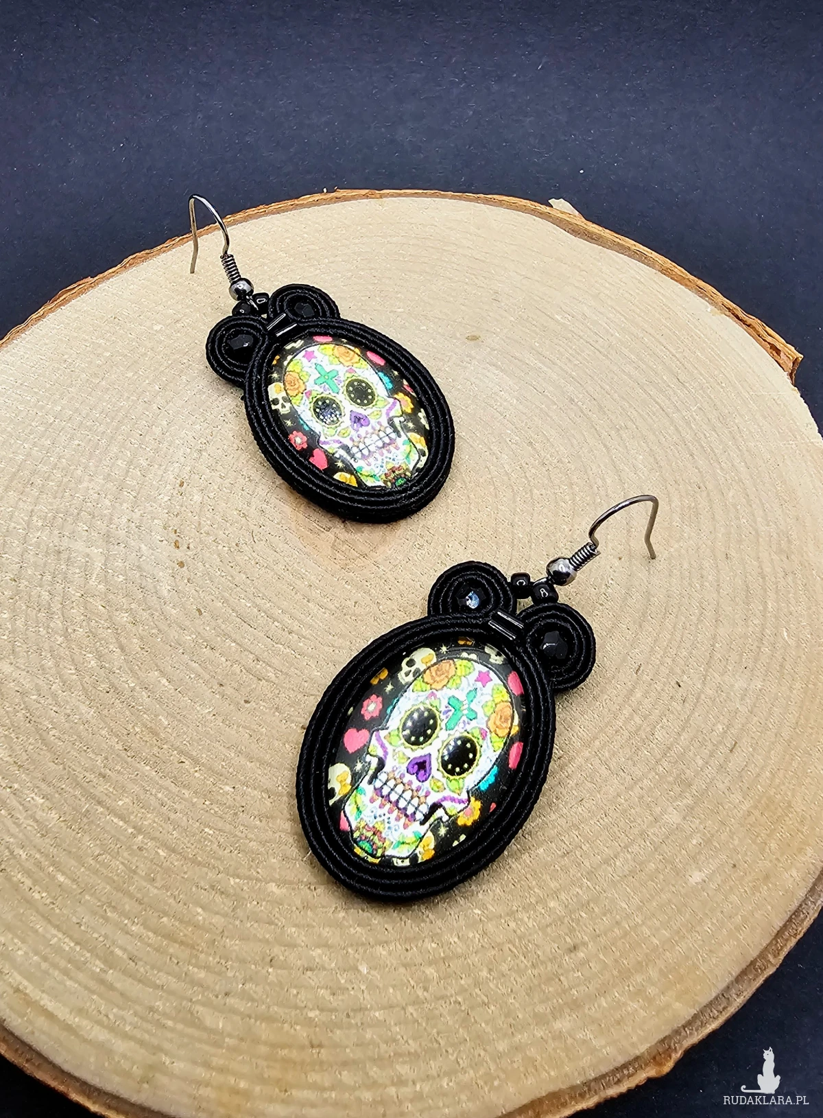 Czarne kolczyki sutasz z kolorowymi czaszkami
