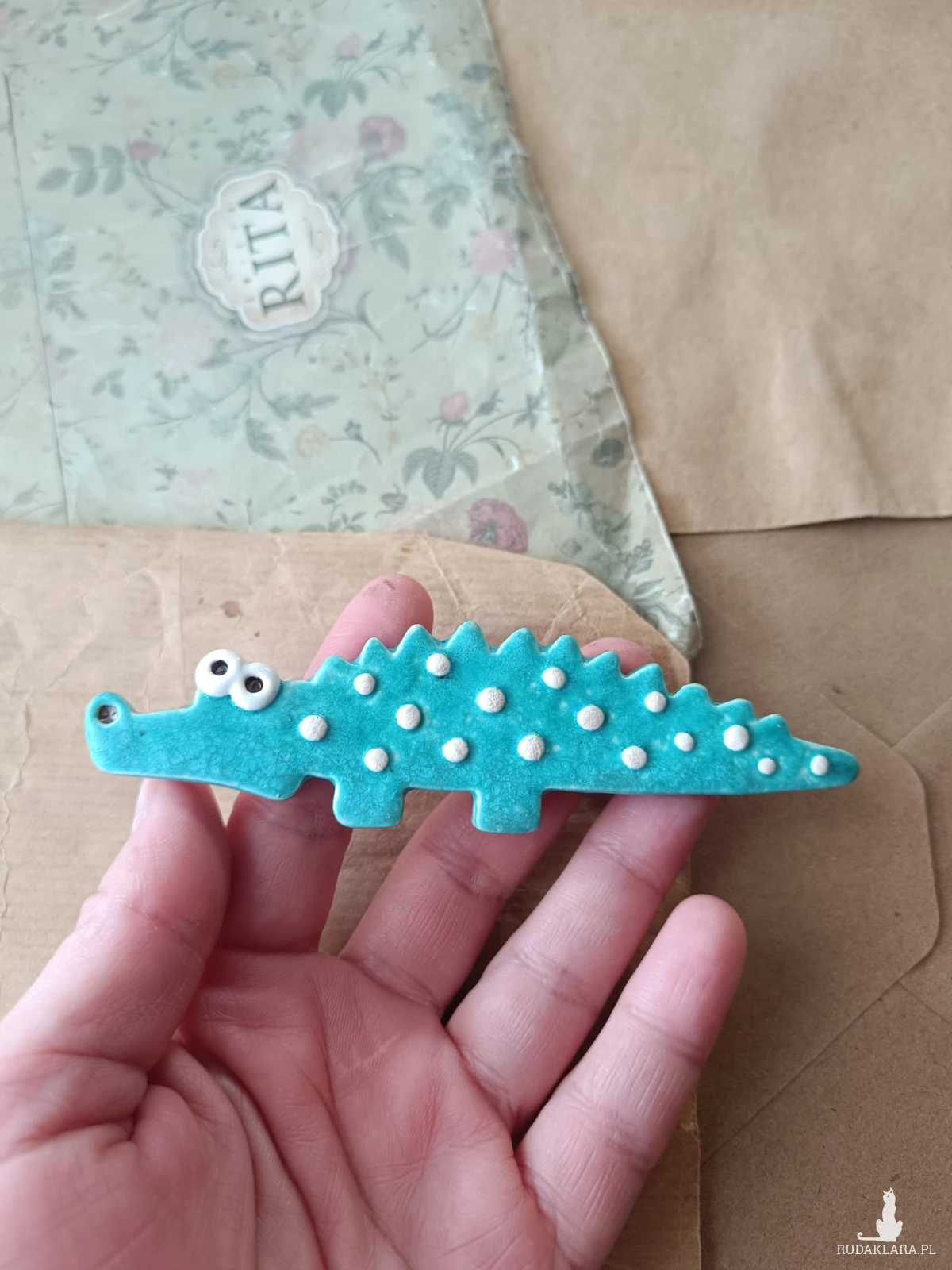 Magnes ceramiczny wykonany z gliny szamotowej, wypalony na biskwit, a następnie szkliwiony w temperaturze 1260 stopni C. Wymiary ok 3 cm x 12 xcm. Serdecznie polecam wszystkim miłośnikom krokodyli.