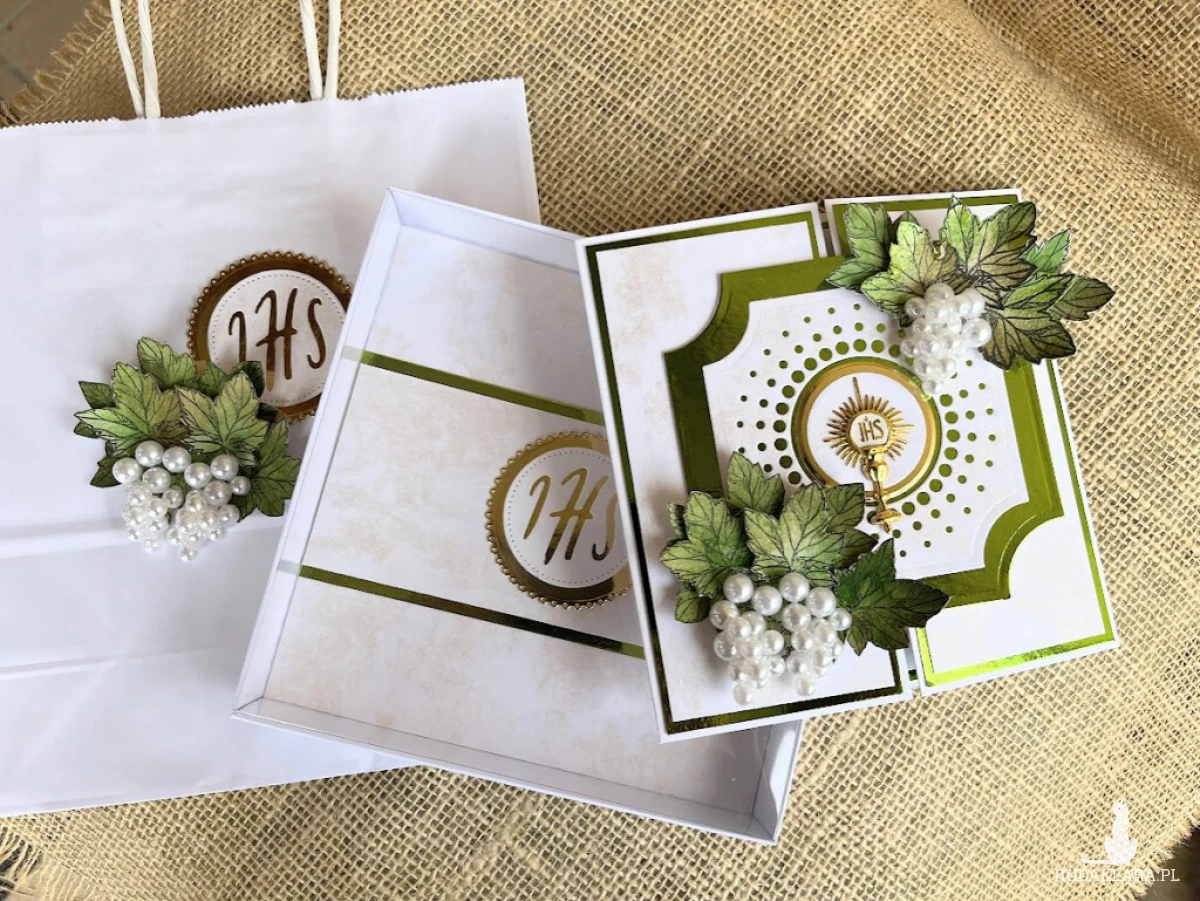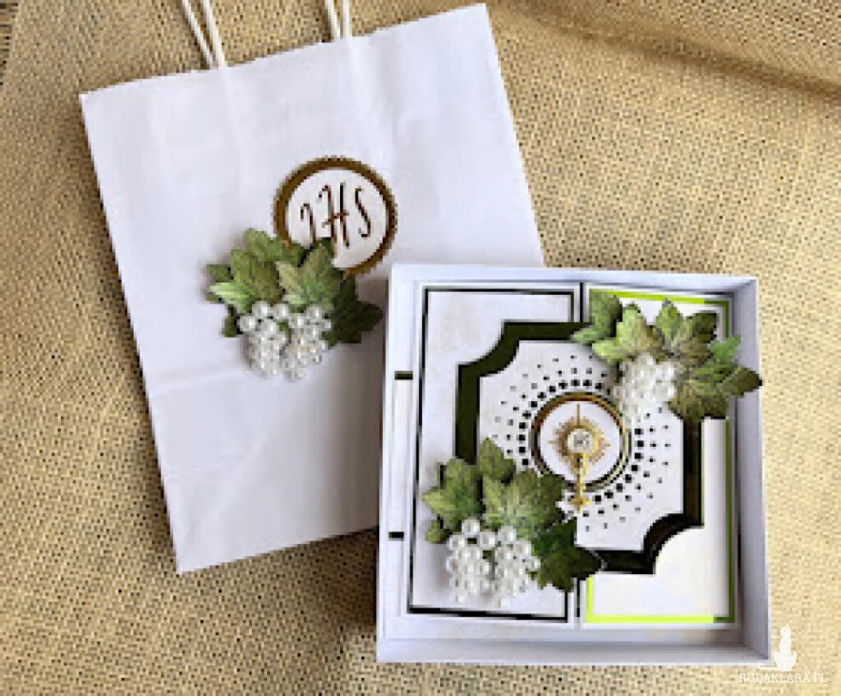 Komplet prezentowy, komunijny zawiera: Piękną i wyjątkową kartkę komunijną w kolorze biało-zielonej; rozmiar kartki 14,0x14,0; pudełko o wymiarach 15,0 x 15,0 z bezbarwnym wieczkiem, wewnątrz kartki gotowe życzenia do własnoręcznego podpisu a na dnie pudelka kieszonka na małe co nieco, Do kompletu biała torebka ozdobiona w tej samej stylistyce co kartka. Wymiar torebki 22,0x18,0. W tej postaci produkt gotowy do natychmiastowej wysyłki