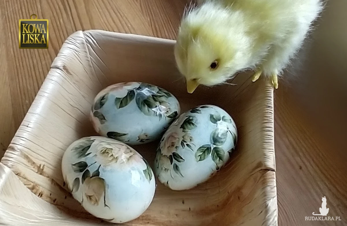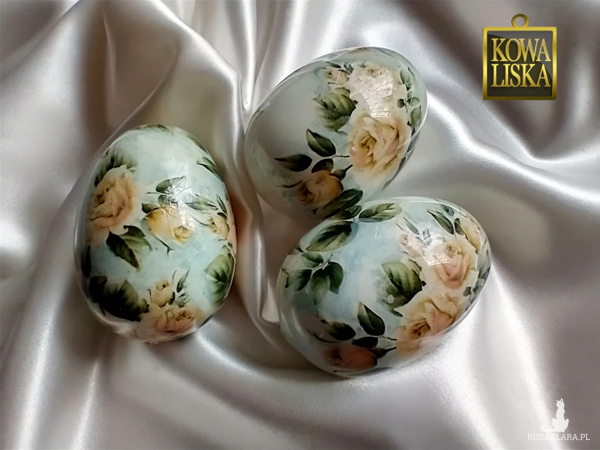 Trwałe pisanki wielkości jaj kurzych, zdobione metodą decoupage i zabezpieczone szklistą warstwą żywicy.
