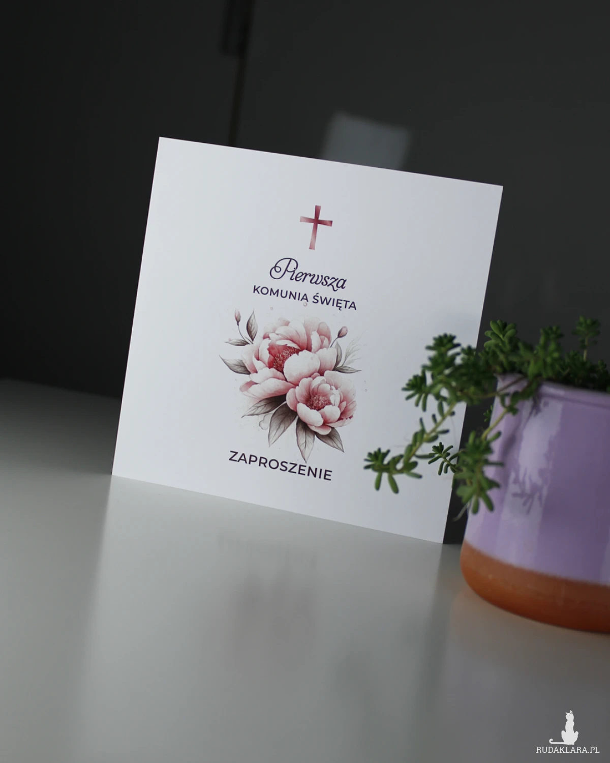 Zaproszenie na Pierwszą Komunię Świętą. Zaproszenie składane do formatu 14x14. Wydruk cyfrowy na papierze kredowym o gramaturze 250g.