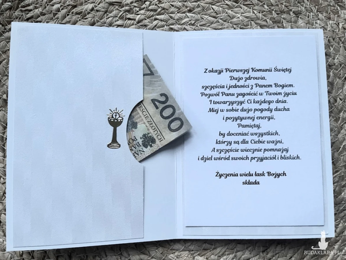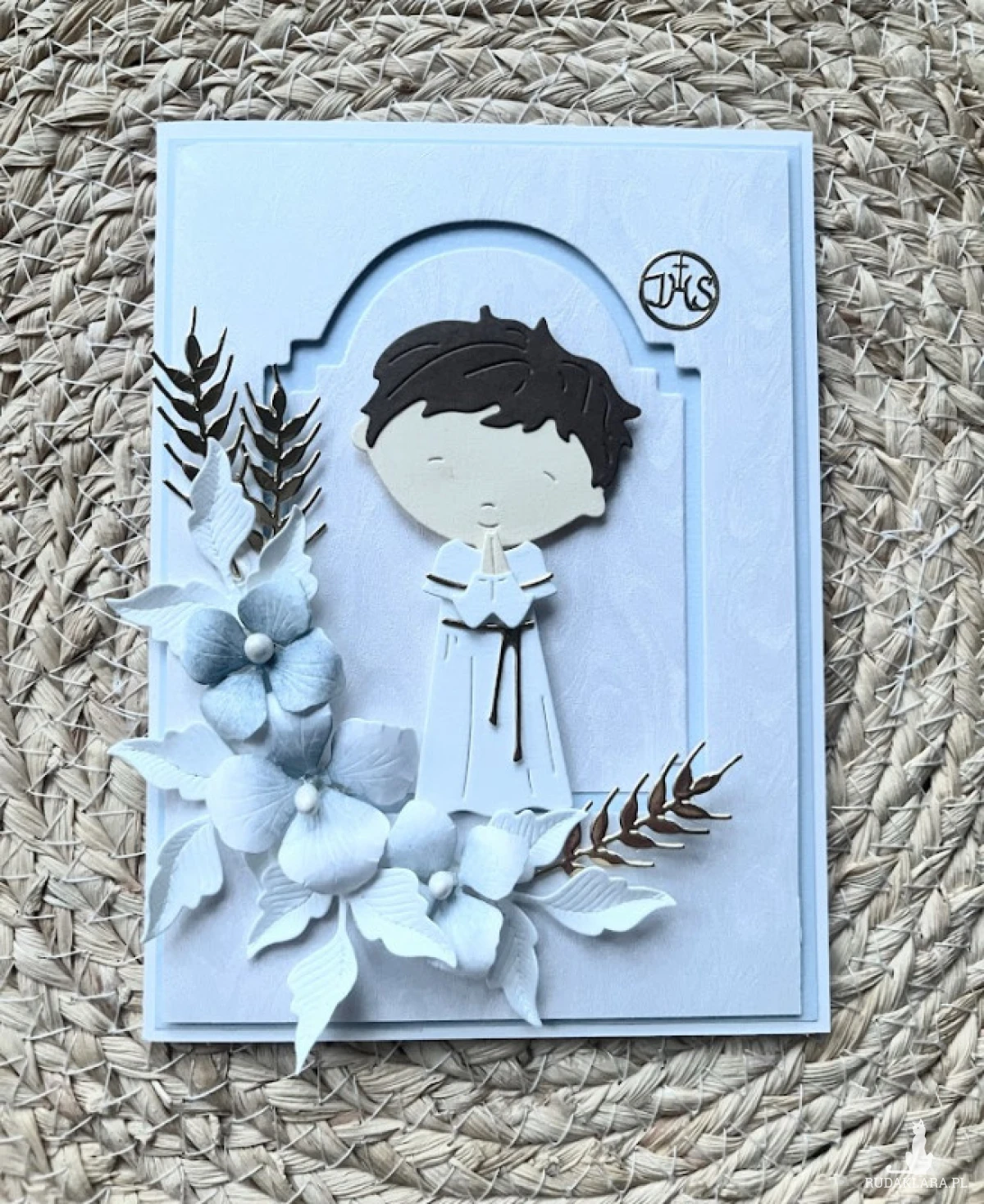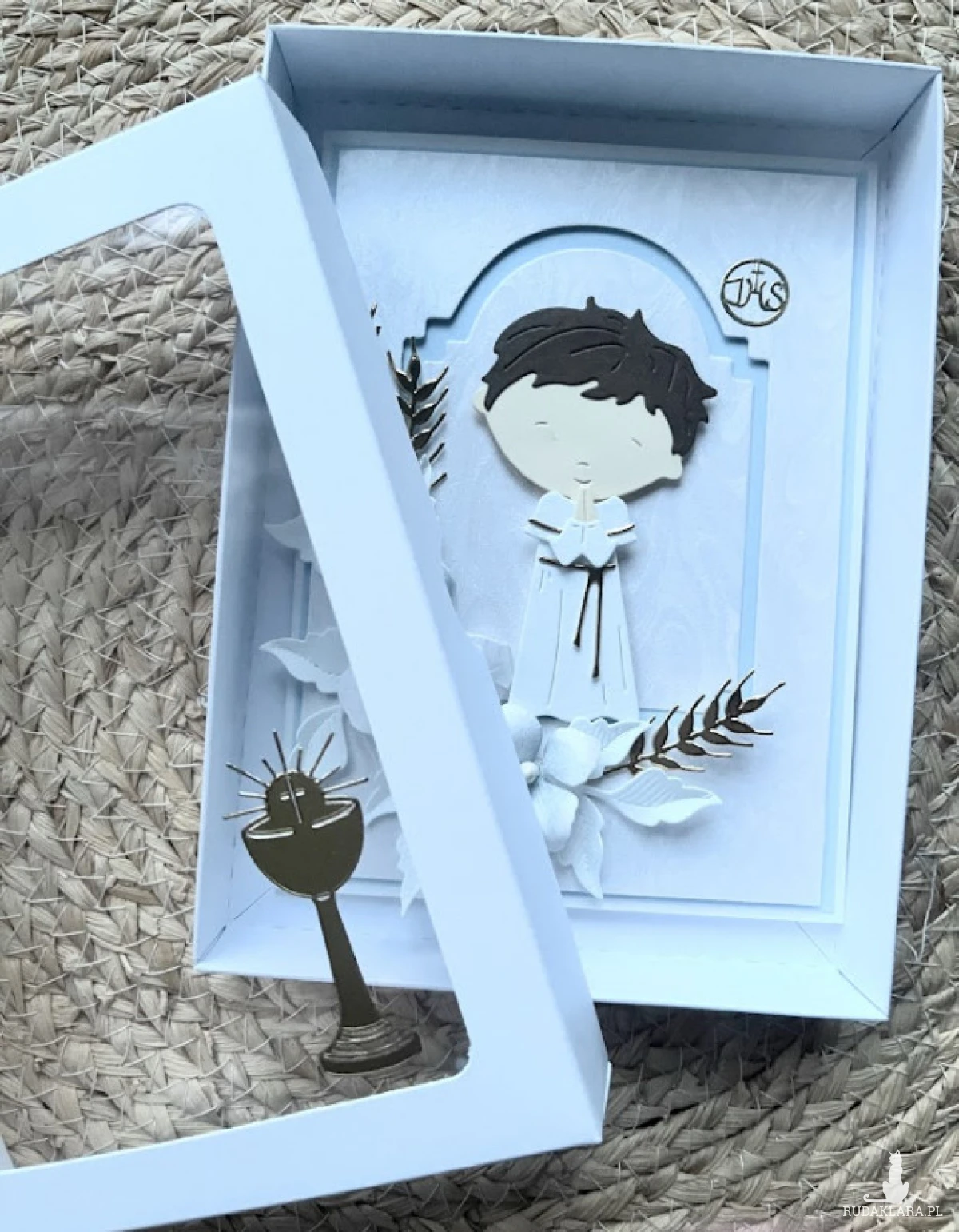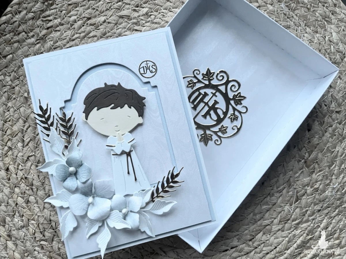 Elegancka, bogato zdobiona kartka w pudełku z okazji Komunii świętej. Utrzymana w delikatnej kolorystyce - bieli i błękitu.ozdobiona kwiatami z papieru oraz postacią chłopca. Kartka jest w całości wykonana ręcznie z najlepszej jakości materiałów do scrapbookingu. Wielkość pudełka 17,0x12,8 x 2,5.Wielkość kartki 15,5x11,5 z gotowymi życzeniami do własnoręcznego podpisu oraz kieszonką na małe co nieco. W tej postaci produkt dostępny od ręki .Polecam