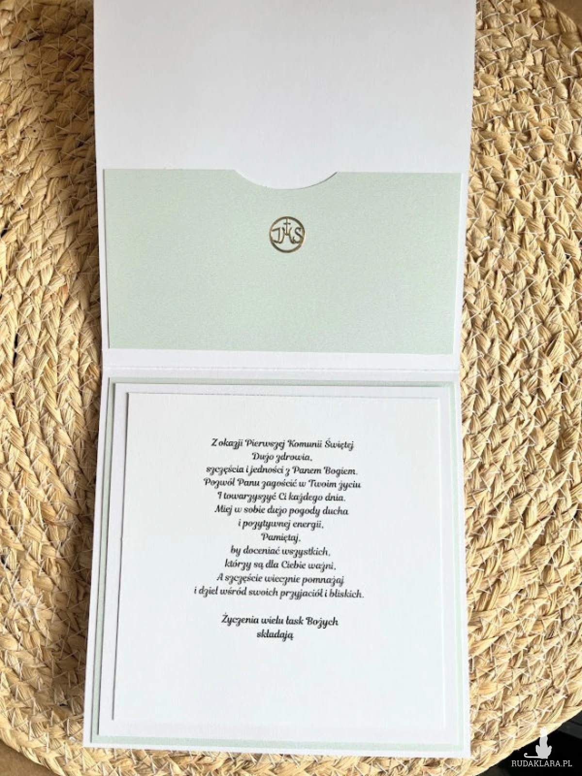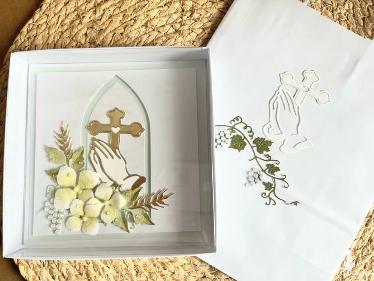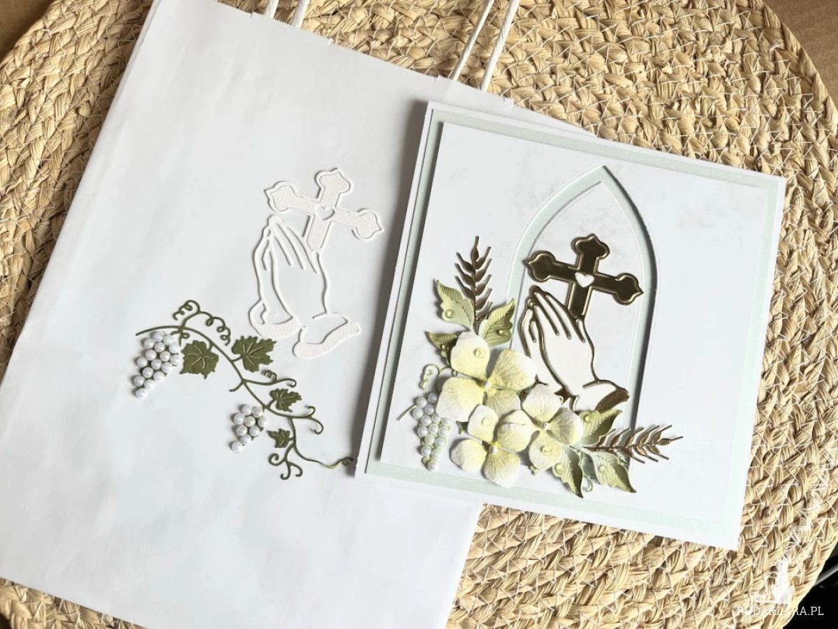 Kartka ręcznie robiona na Komunię Świętą , w pastelowych kolorach z dodatkiem lustrzanego złota. Wewnątrz kartki gotowe życzenia do własnoręcznego podpisu oraz miejsce z kieszonką na małe co nieco. Wielkość kartki 14,5x14,5cm .pudełka15,5x15,5cm Do kartki dołączono torebkę w tej samej stylizacji co kartka, wymiary 22,5x18x8 cm.W tej postaci kartka do natychmiastowej wysyłki,