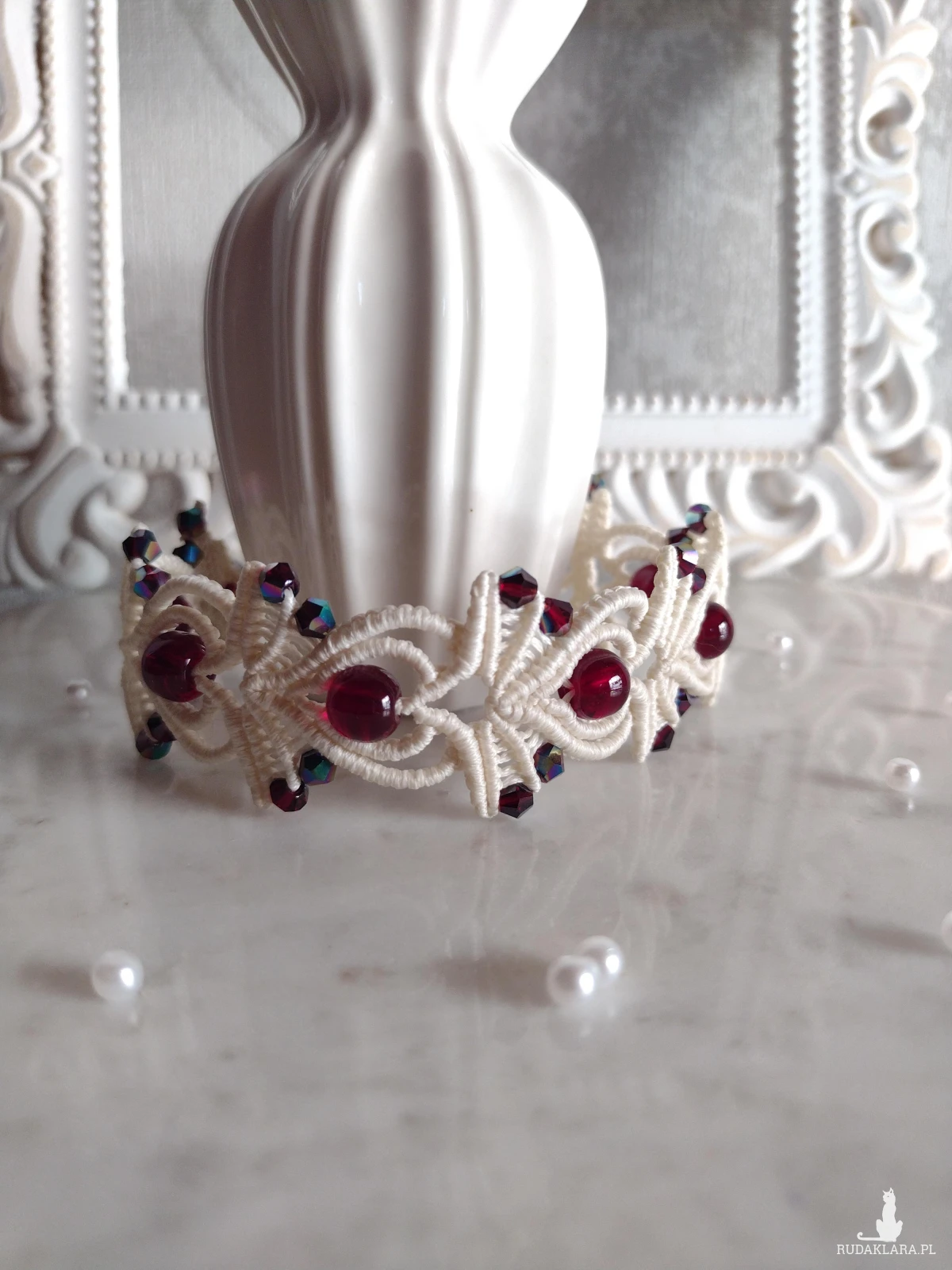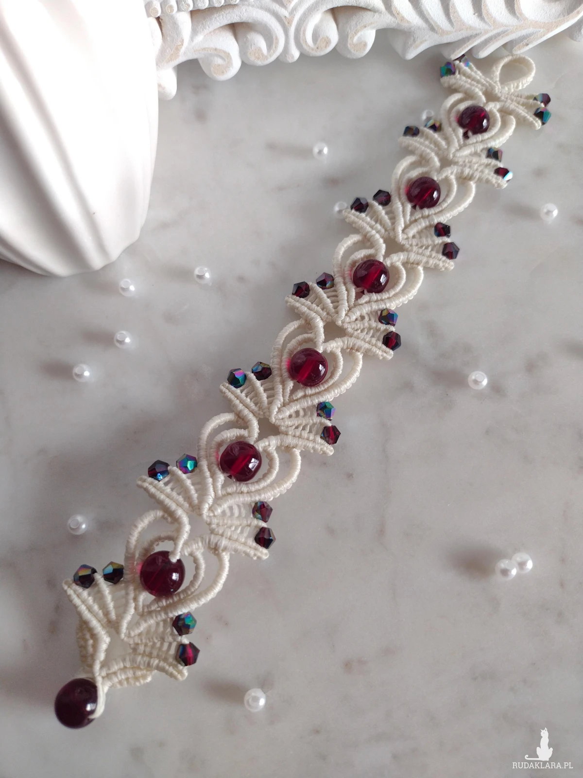 Ręcznie wykonana bransoletka w odcieniu kremowej bieli łączy subtelność mikromakramy z głębokim kolorem granatowych kamieni. Ich intensywna barwa pięknie kontrastuje z jasną bazą, tworząc elegancką i przyciągającą spojrzenia kompozycję.