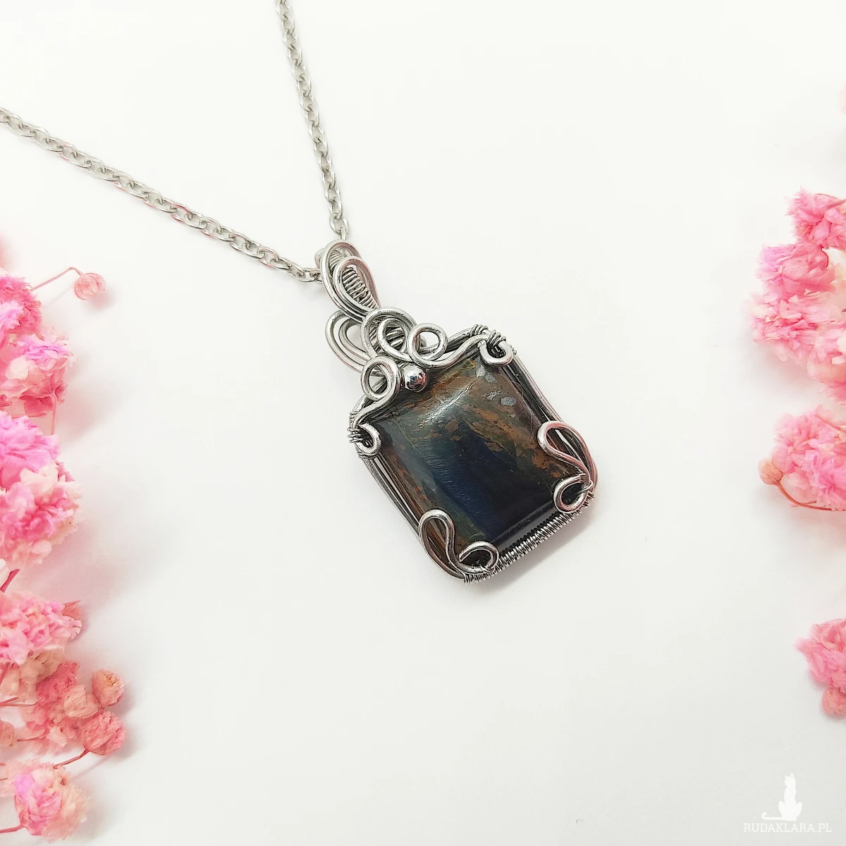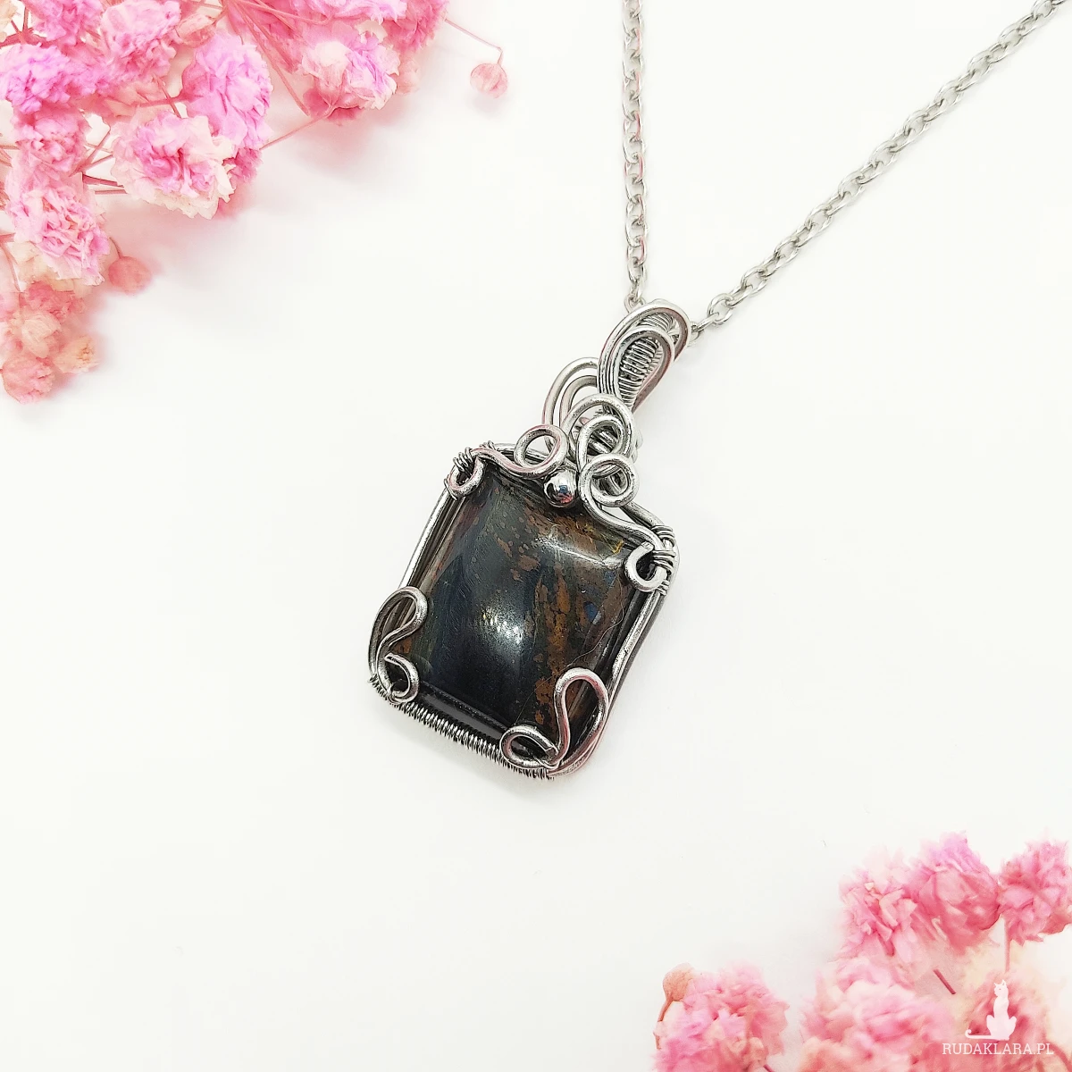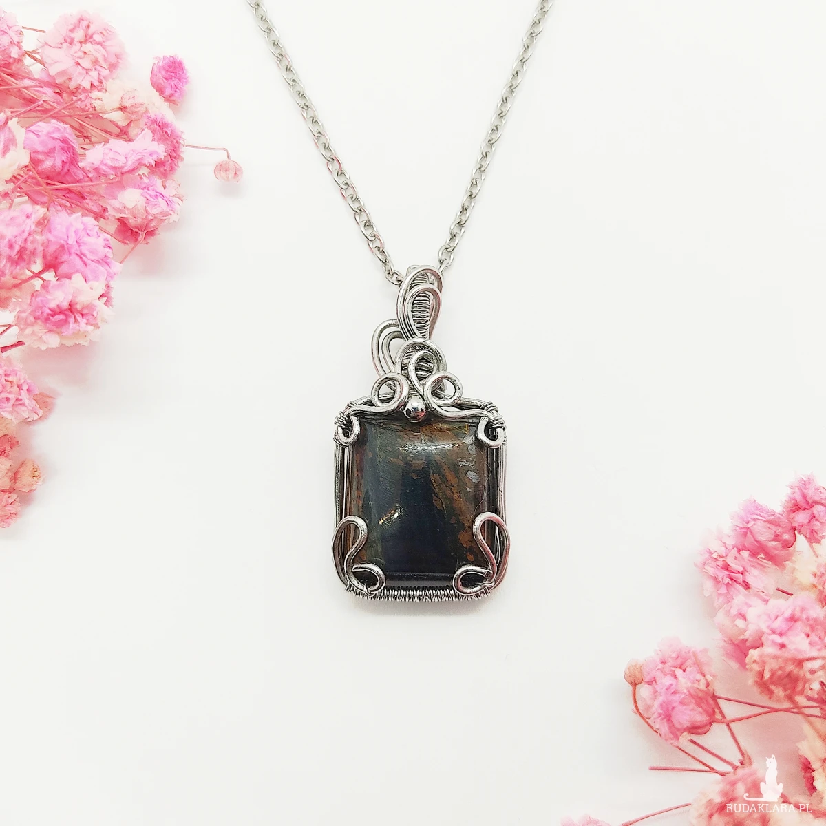 Naszyjnik Pietersyt ręcznie robiony. Wykonany techniką wire wrapping z drutów ze stali chirurgicznej.