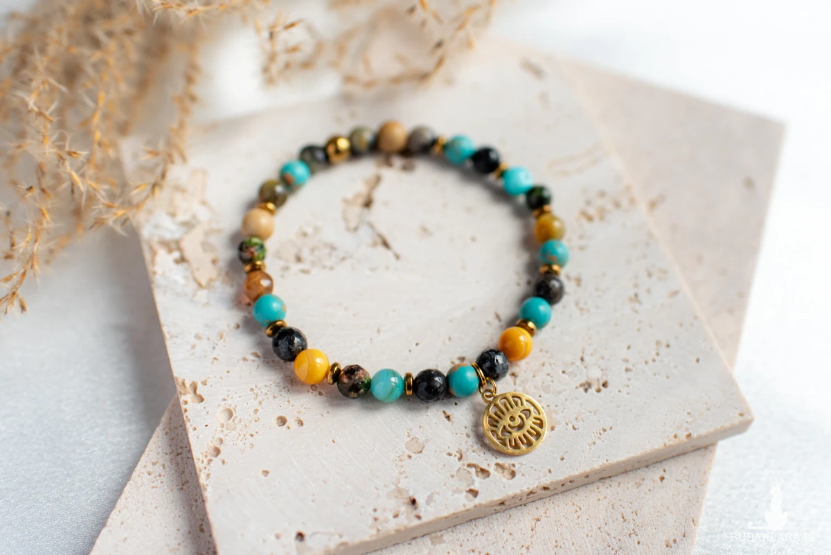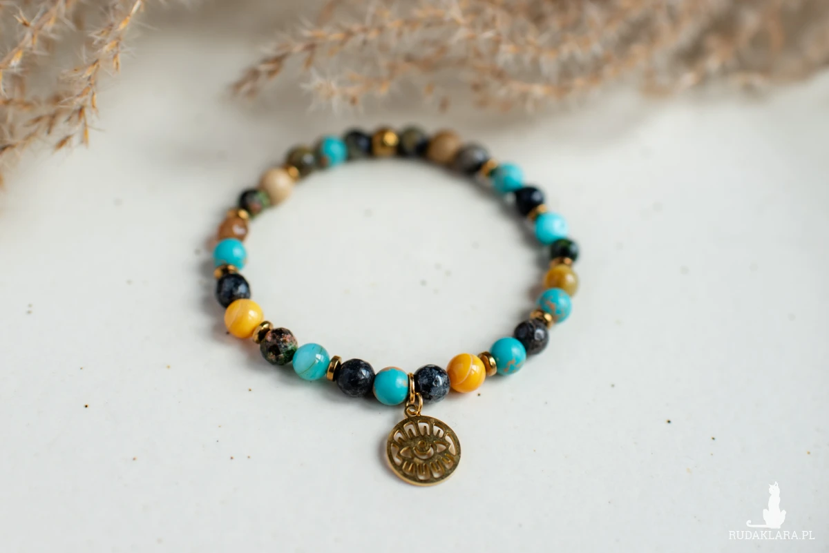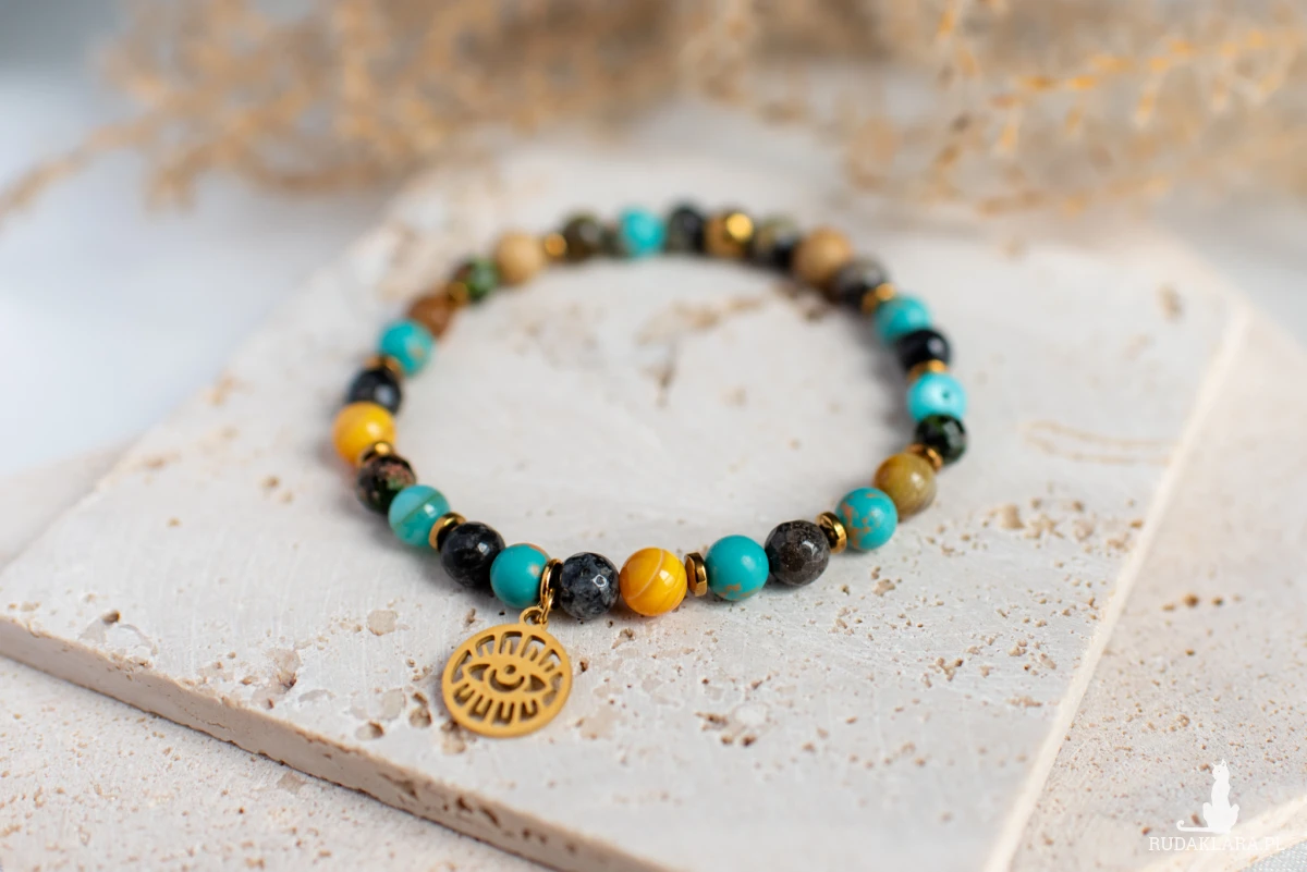 Energetyczny mix kamieni naturalnych. Bransoletka z magnezytu, unakitu, agatu, jaspisu i masy perłowej z zawieszką oko proroka.