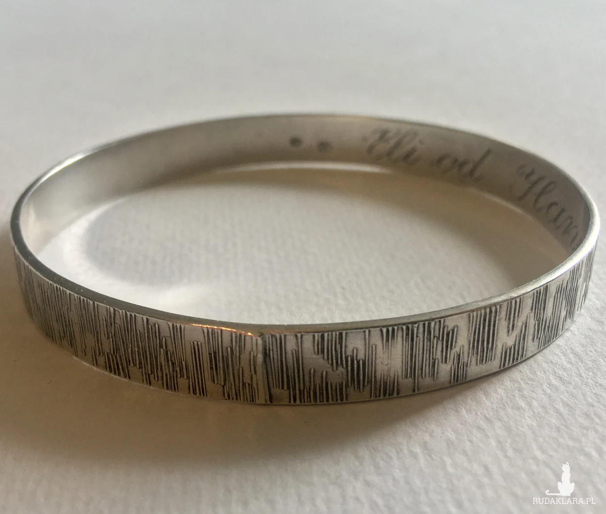 Przepiękna srebrna bransoletka, sztywne kółko. Bransoletka pochodzi z lat 60. Jest w idealnym stanie, może być pięknym prezentem dla kogoś bliskiego. Bransoletka wewnątrz ma grawer - Eli od Hani. Można oczywiście go zlikwidować. Chcę zaznaczyć, że wszystkie wystawione przedmioty kolekcjonerskie należą do mnie.