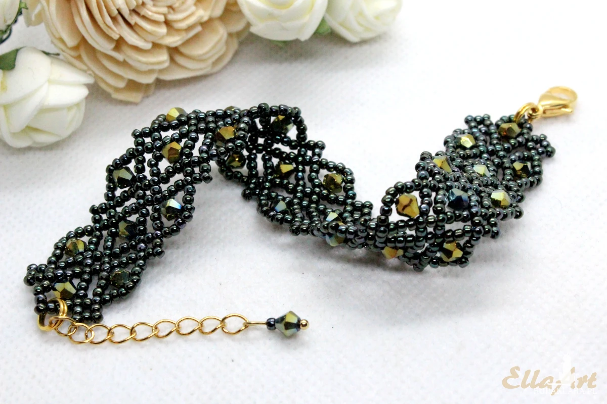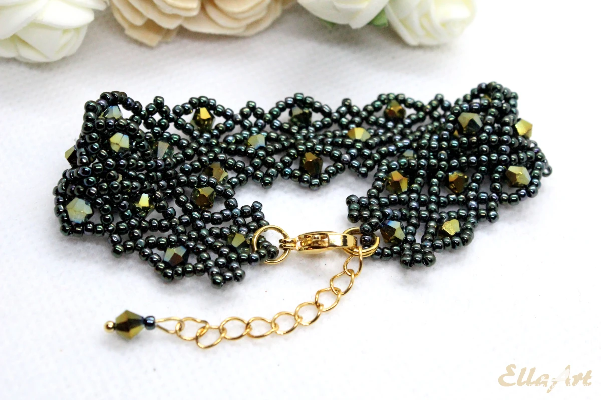 - uszyta ze szklanych, mieniącychsię kryształków 4mm oraz drobniutkich koralików japońskiej firmy Toho w kolorze ciemnej zieleni