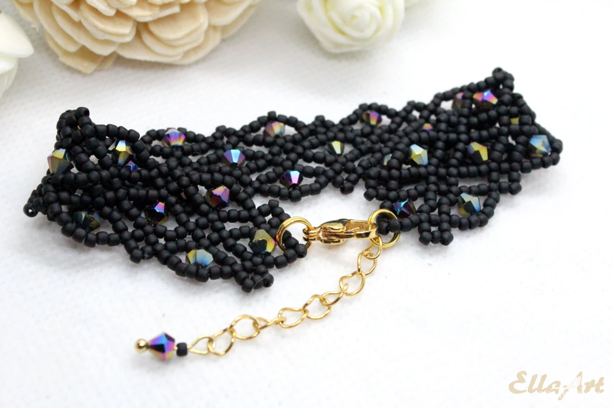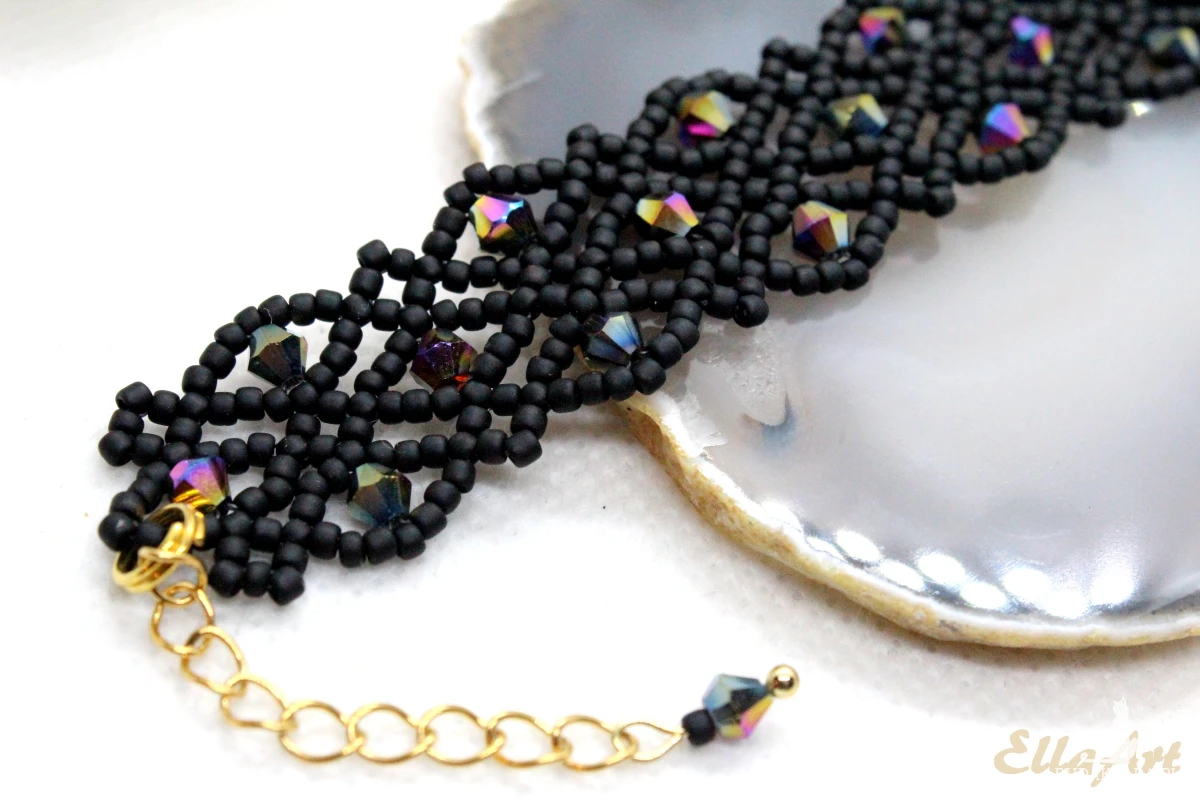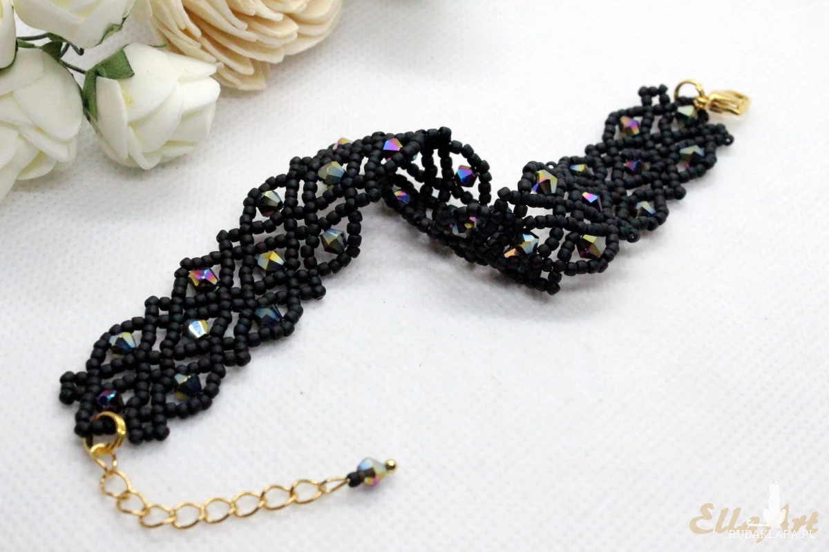 - uszyta ze szklanych, mieniących się kryształków 4mm oraz drobniutkich koralików japońskiej firmy Toho w kolorze matowej czerni