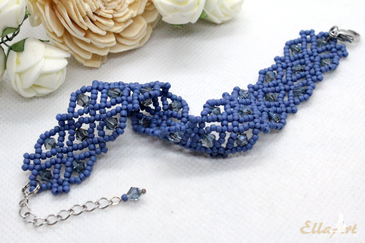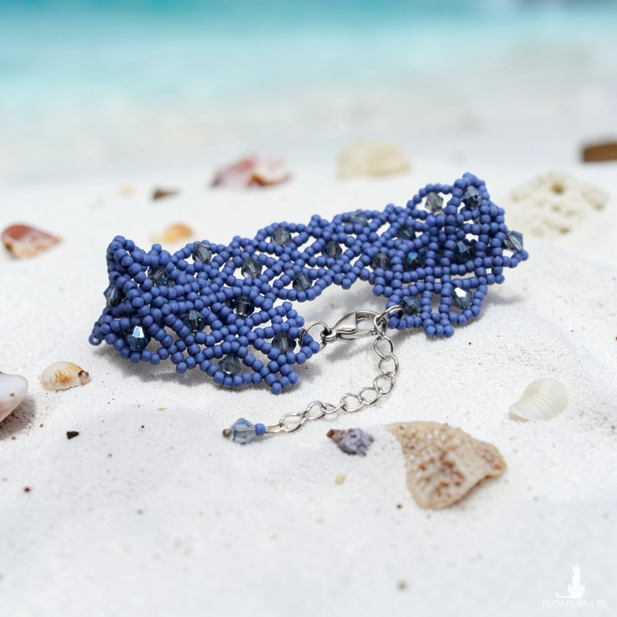 - uszyta ze szklanych, mieniących się kryształków 4mm oraz drobniutkich koralików japońskiej firmy Toho w kolorze stalowo niebieskim