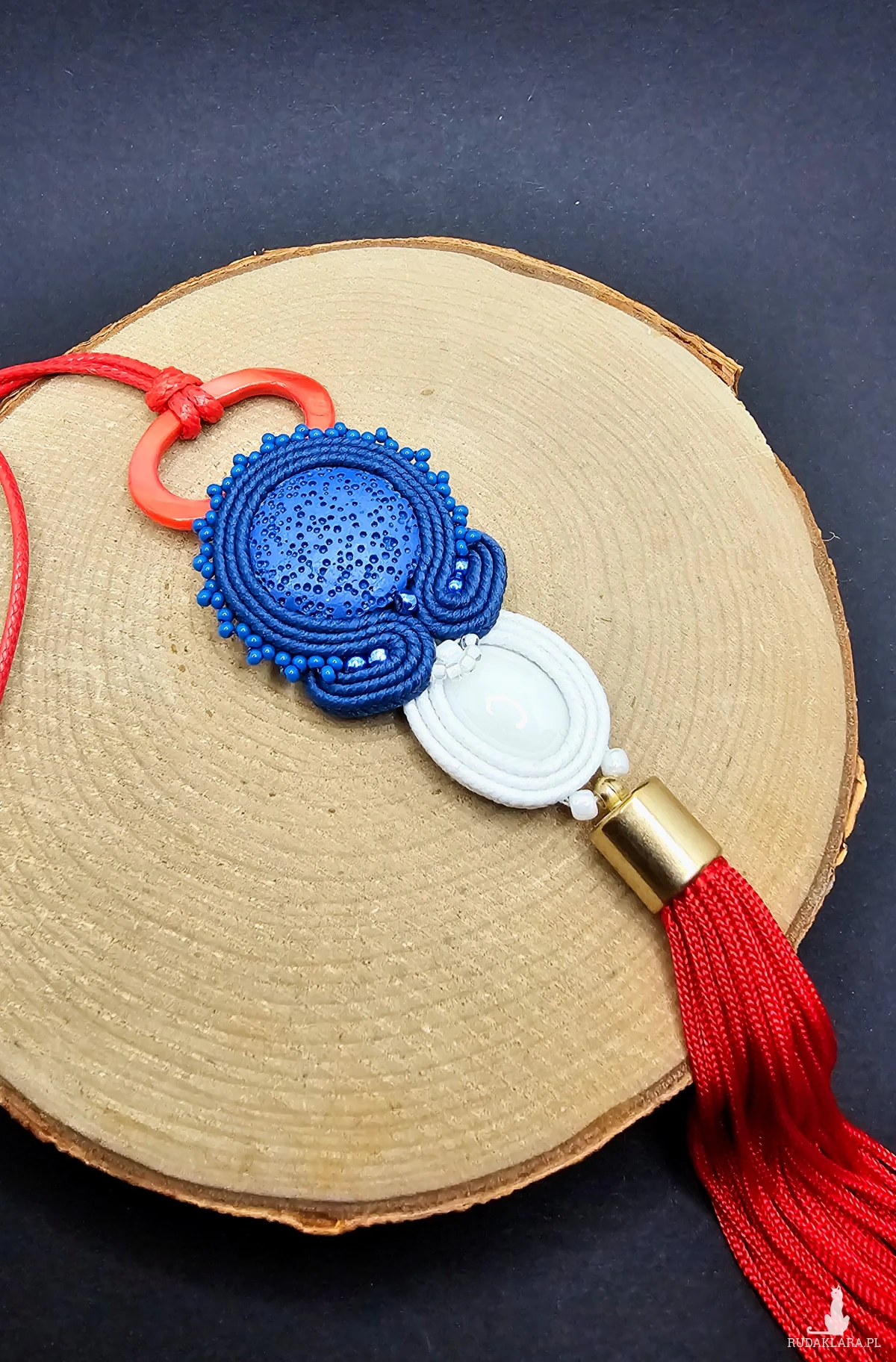 Kaboszony z granatowej lawy i białej ceramiki otoczone polskimi sznurkami sutasz oraz szklanymi czeskimi i japońskimi koralikami o różnych kształtach i wielkościach. Dół wisiora zakończony czerwonym chwostem w złotej oprawie. Górę wisiora zdobi owalna masa perłowa. Wisior zawieszony na czerwonym powlekanym sznurku z możliwością regulacji długości.