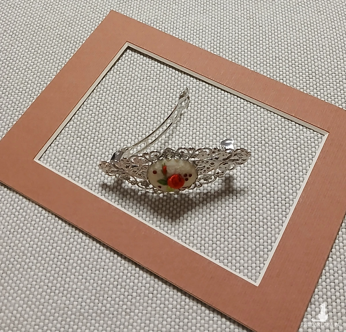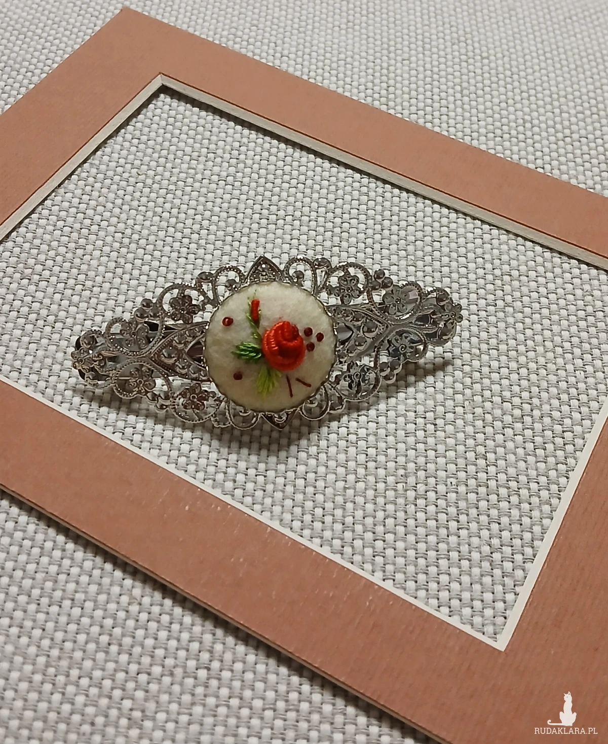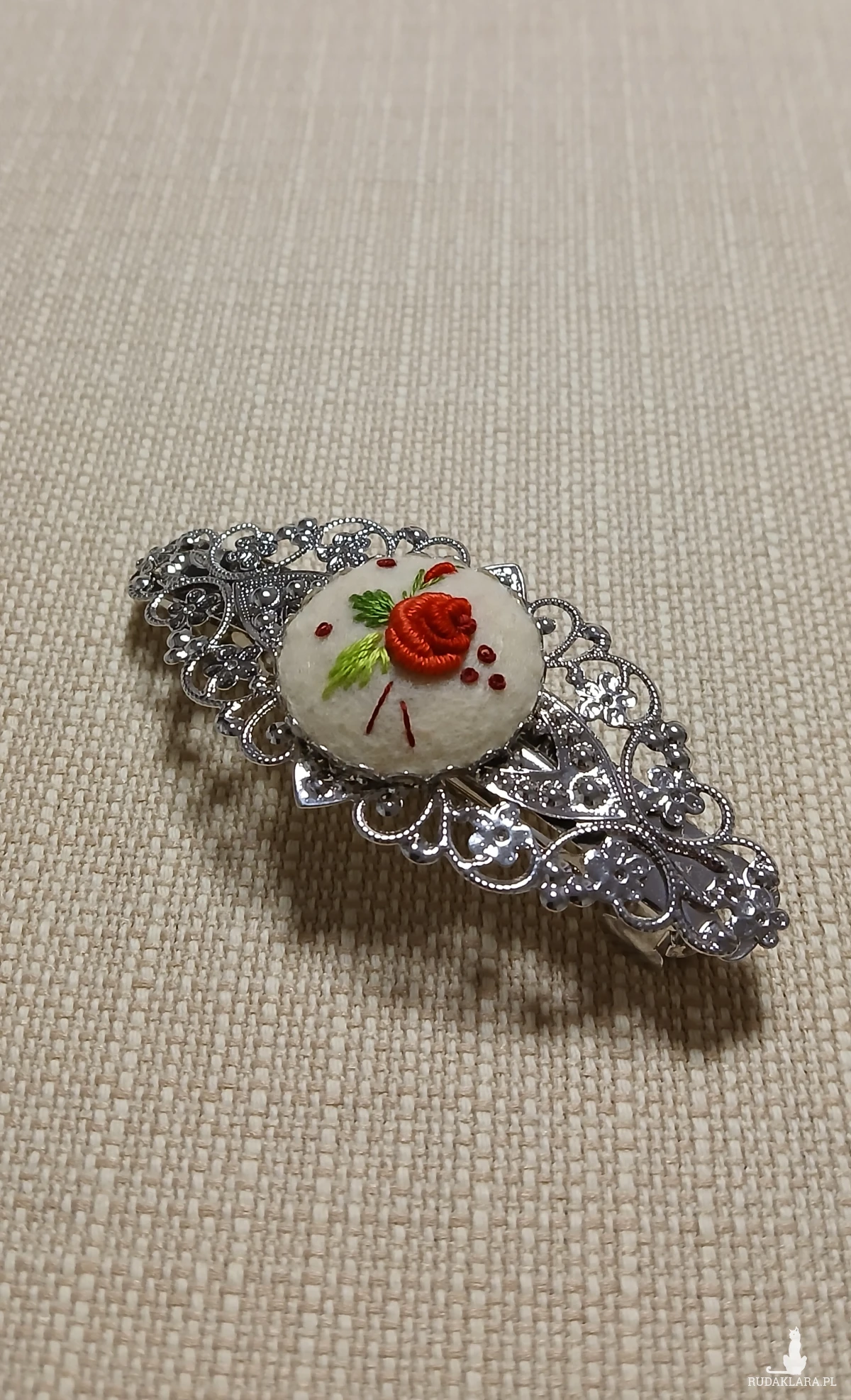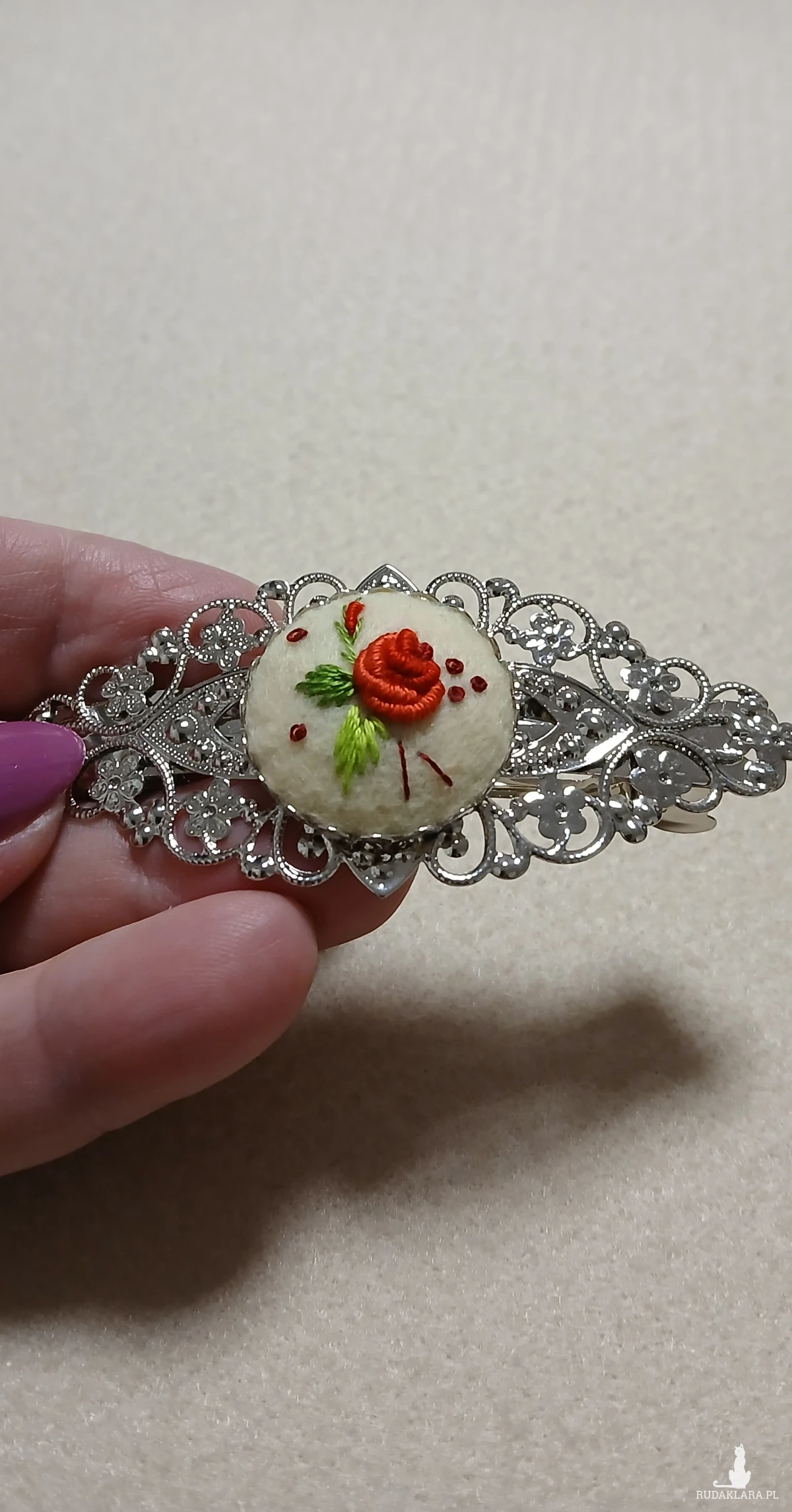 Połączenie ornamentu w kolorze srebra z haftem ręcznym tworzy ciekawą ozdobę do włosów.