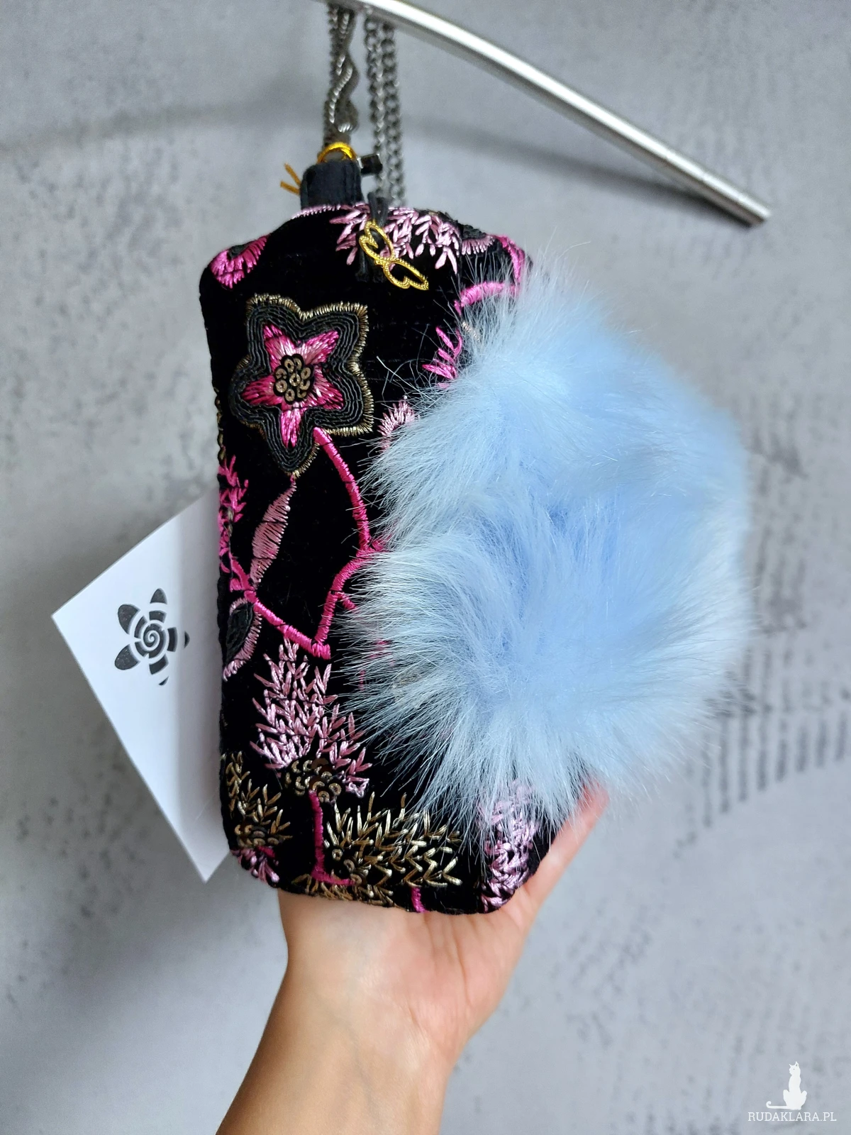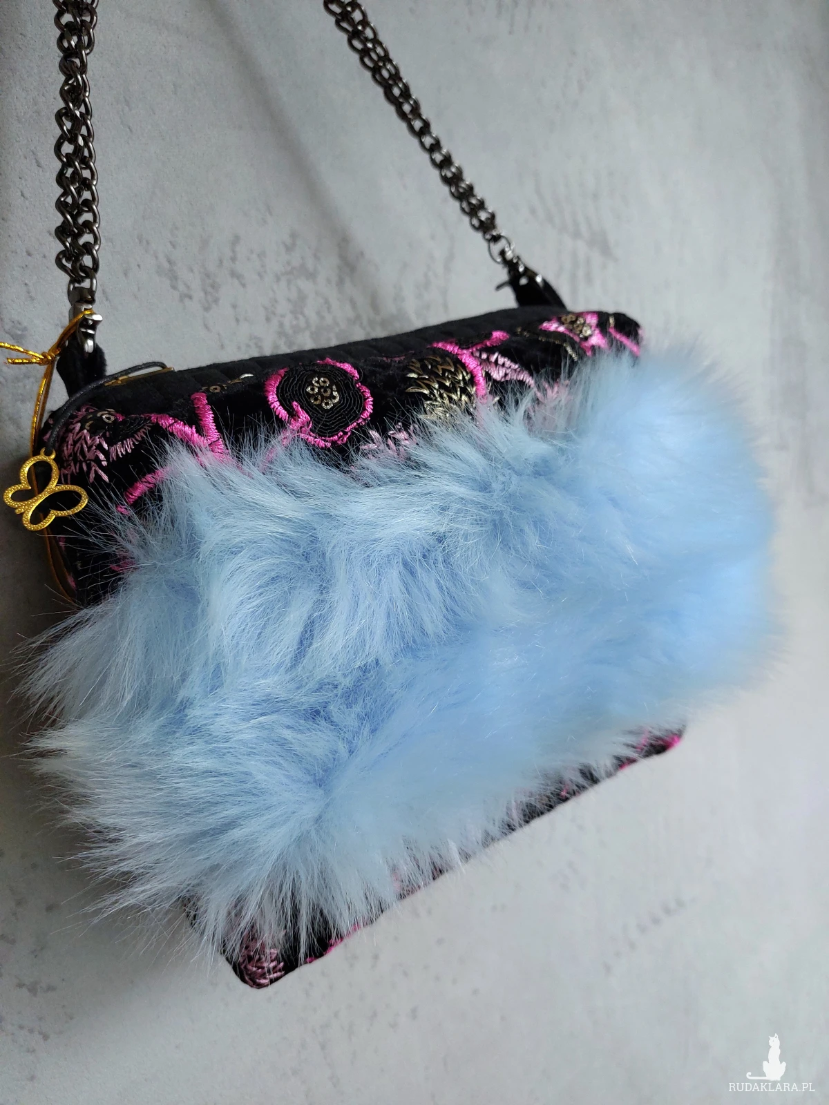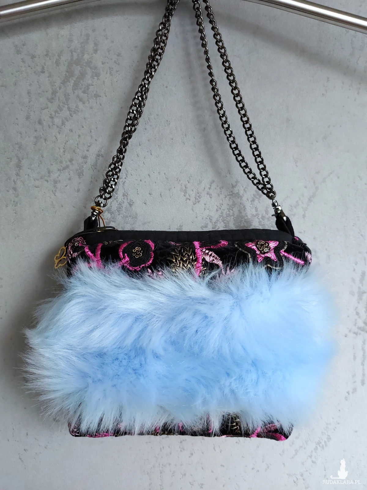 Ozdobna wyjazdowa kosmetyczka w kształcie kuferka z łańcuszkowym uchwytem. Kosmetyczka wykonana jest z czarnego, haftowanego aksamitu, oraz przemiłego w dotyku futerka w odcieniu baby blue. Wnętrze z różowej satyny. Kosmetyczka powstała w jednym, niepowtarzalnym egzemplarzu. Wymiary: 18/ 17/ 8 cm, całkowita długość łańcuszka 49 cm.