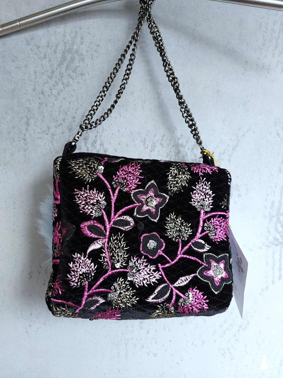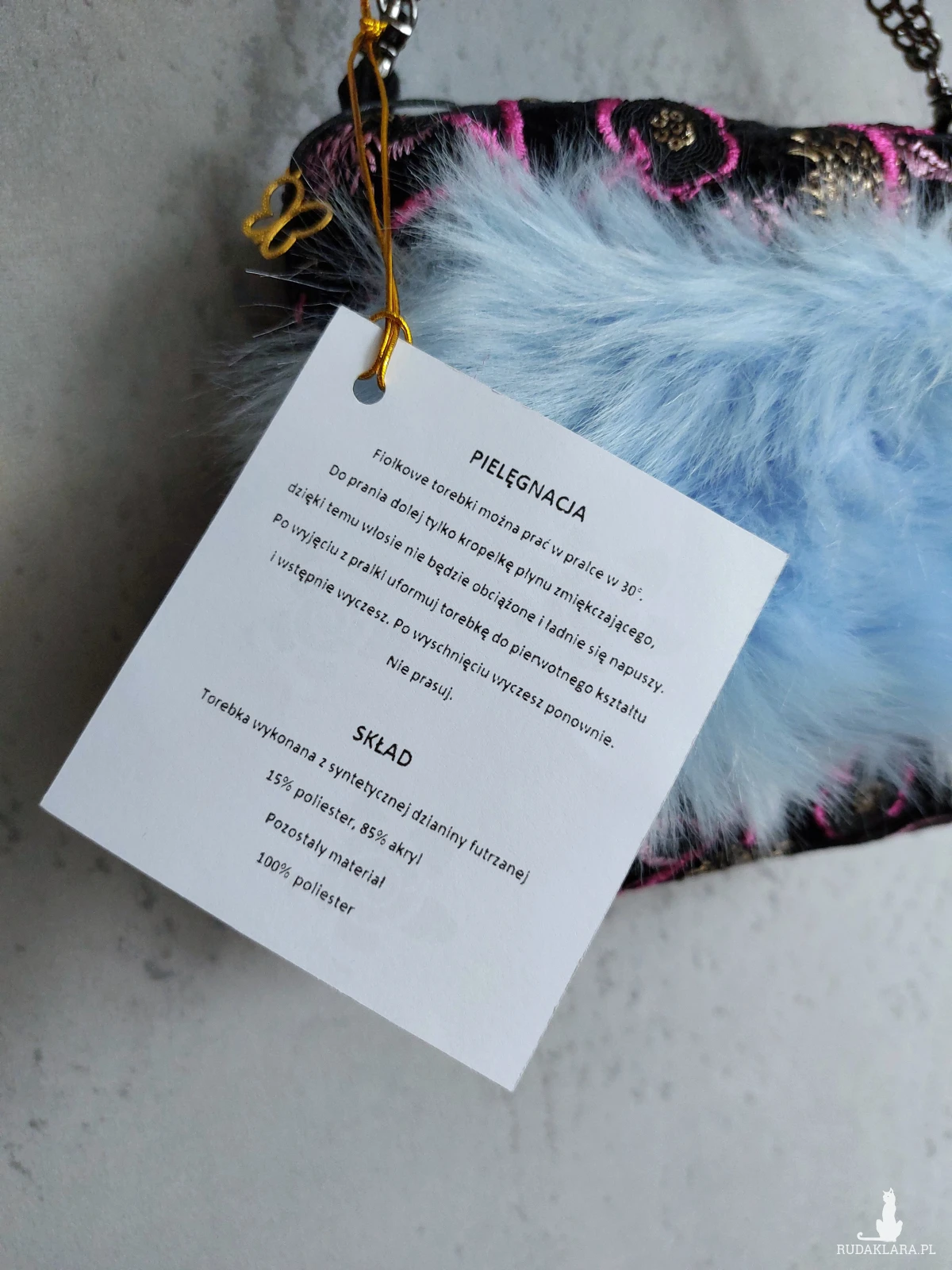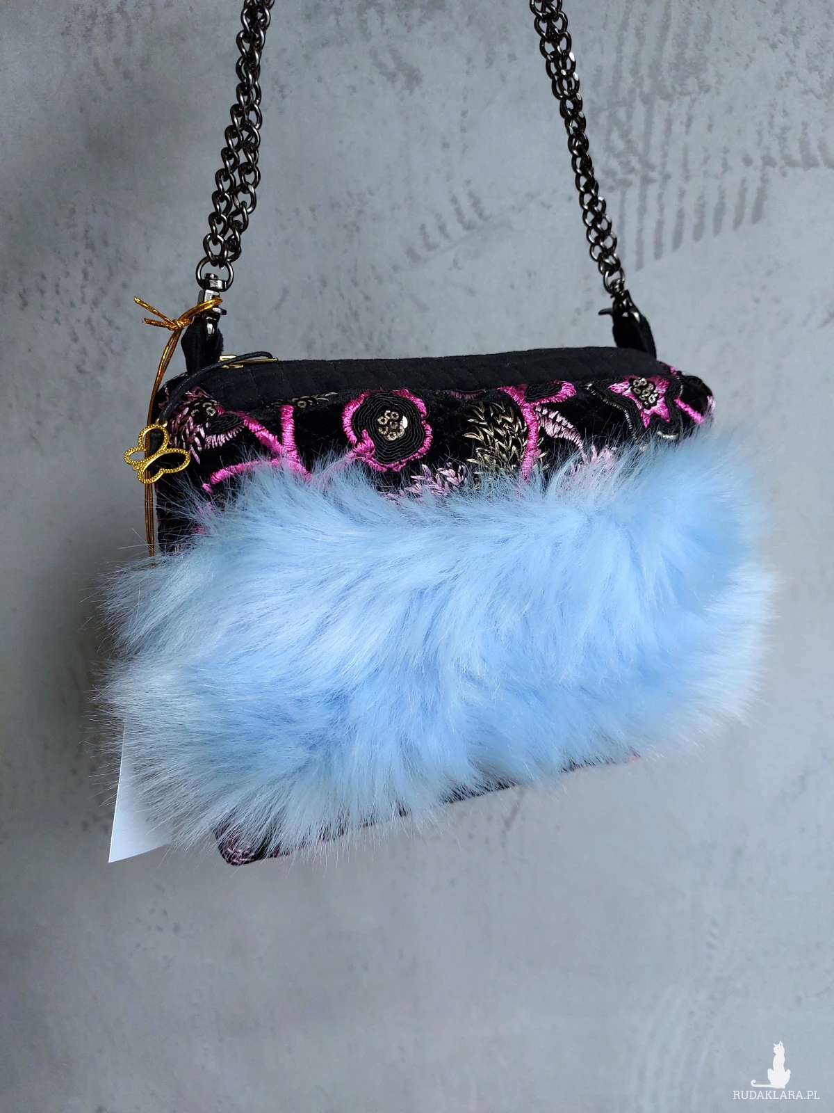 Ozdobna wyjazdowa kosmetyczka w kształcie kuferka z łańcuszkowym uchwytem. Kosmetyczka wykonana jest z czarnego, haftowanego aksamitu, oraz przemiłego w dotyku futerka w odcieniu baby blue. Wnętrze z różowej satyny. Kosmetyczka powstała w jednym, niepowtarzalnym egzemplarzu. Wymiary: 18/ 17/ 8 cm, całkowita długość łańcuszka 49 cm.