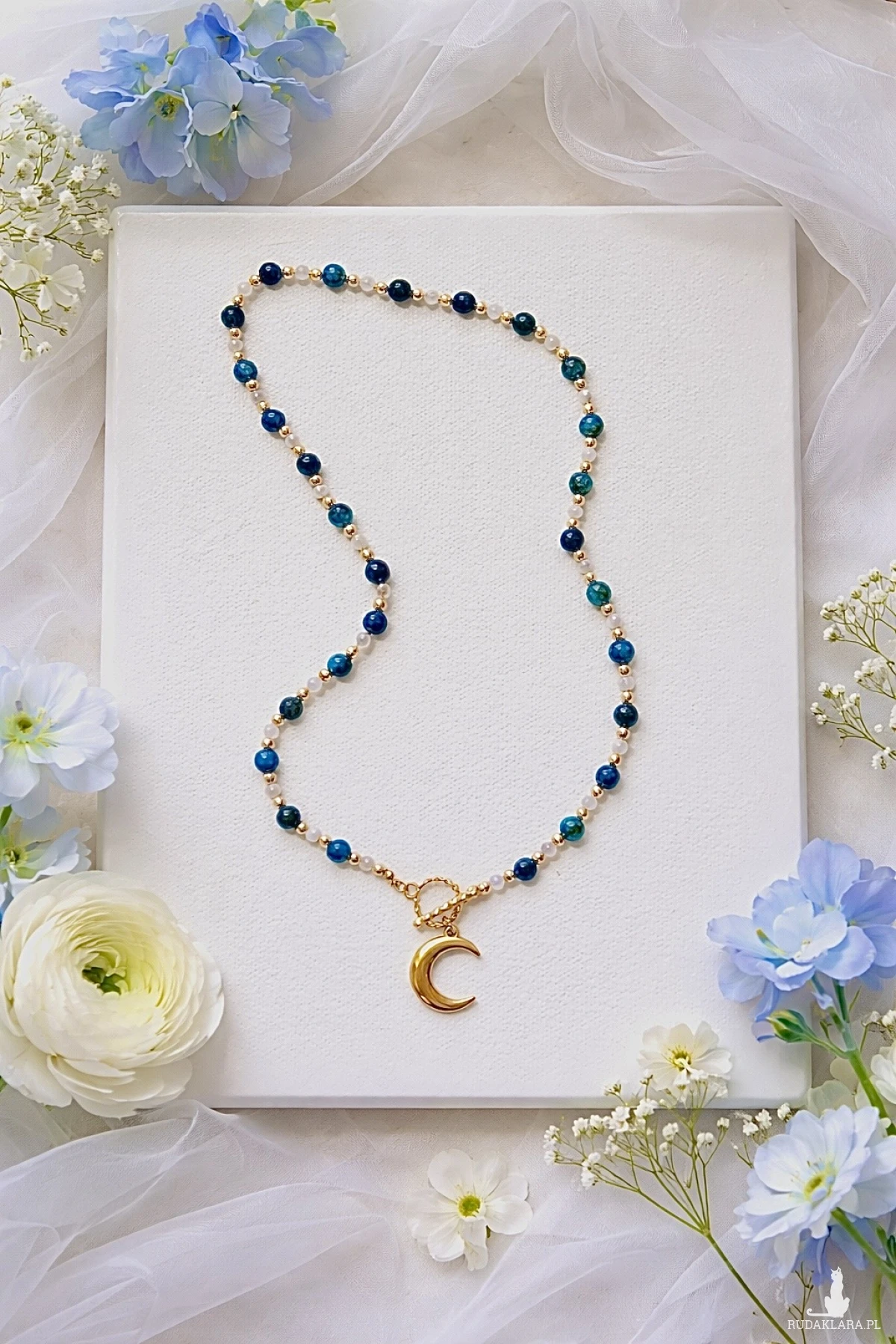 Połączenie apatytu, kamienia księżycowego i hematytu tworzy kompozycję pełną balansu — między świeżością a elegancją, między delikatnością a wyrazistością. Złoty półksiężyc dodaje całości miękkiego, kobiecego akcentu i przyciąga spojrzenia w nienachalny sposób.