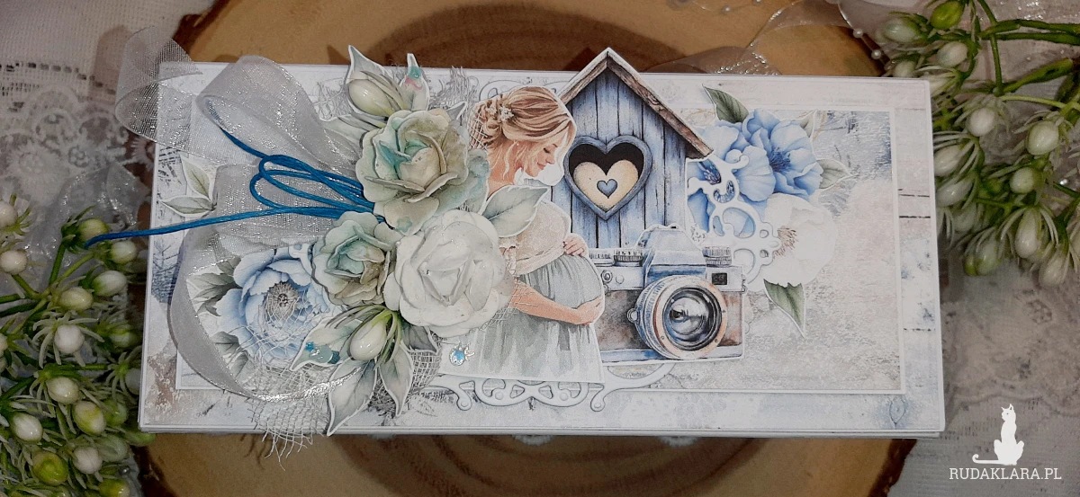 Czekoladownik czyli ozdobne pudełko na czekoladę o wymiarach 19x8.9x1,2 cm. Zmieści się do niego czekolada Milka. W środku karteczka podklejona taśmą dwustronną, na której można wypisać życzenia i przykleić na wewnętrznej stronie wieczka.