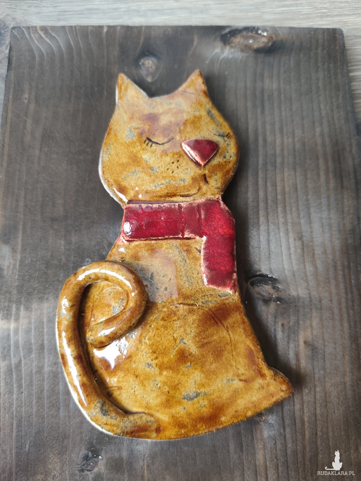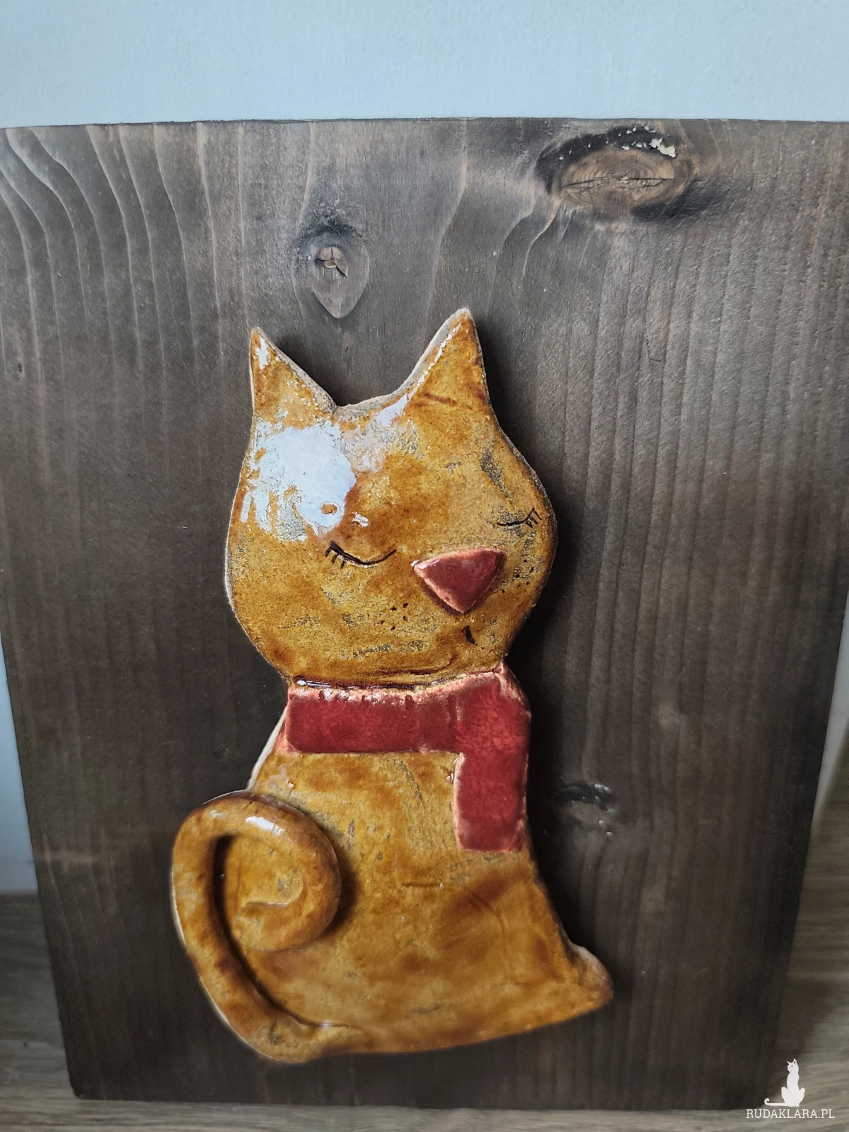 Kot ceramiczny ręcznie wykonany umocowany na postarzanej desce. Wykonany z gliny szamotowej, szkliwiony i dwukrotnie wypalany w piecu ceramicznym na wysoka temperaturę. Z tyłu na desce zaczepy do powieszenia na ścianie. Polecam