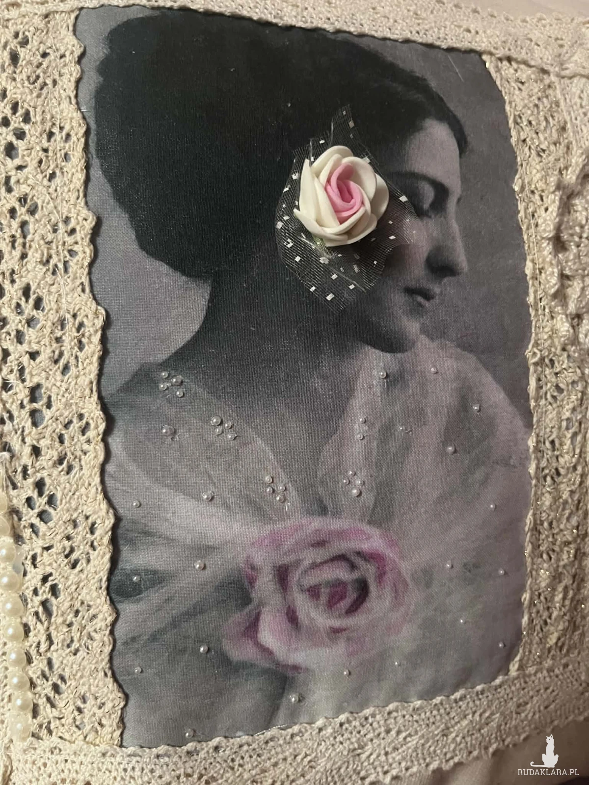 Poszewka na poduszkę rozm 40x40cm uszyta z płótna bawełnianego. Zapinana na guziki ozdobiona nadrukiem bawełnianą koronką I szydełkową serwetką. Polecam serdecznie