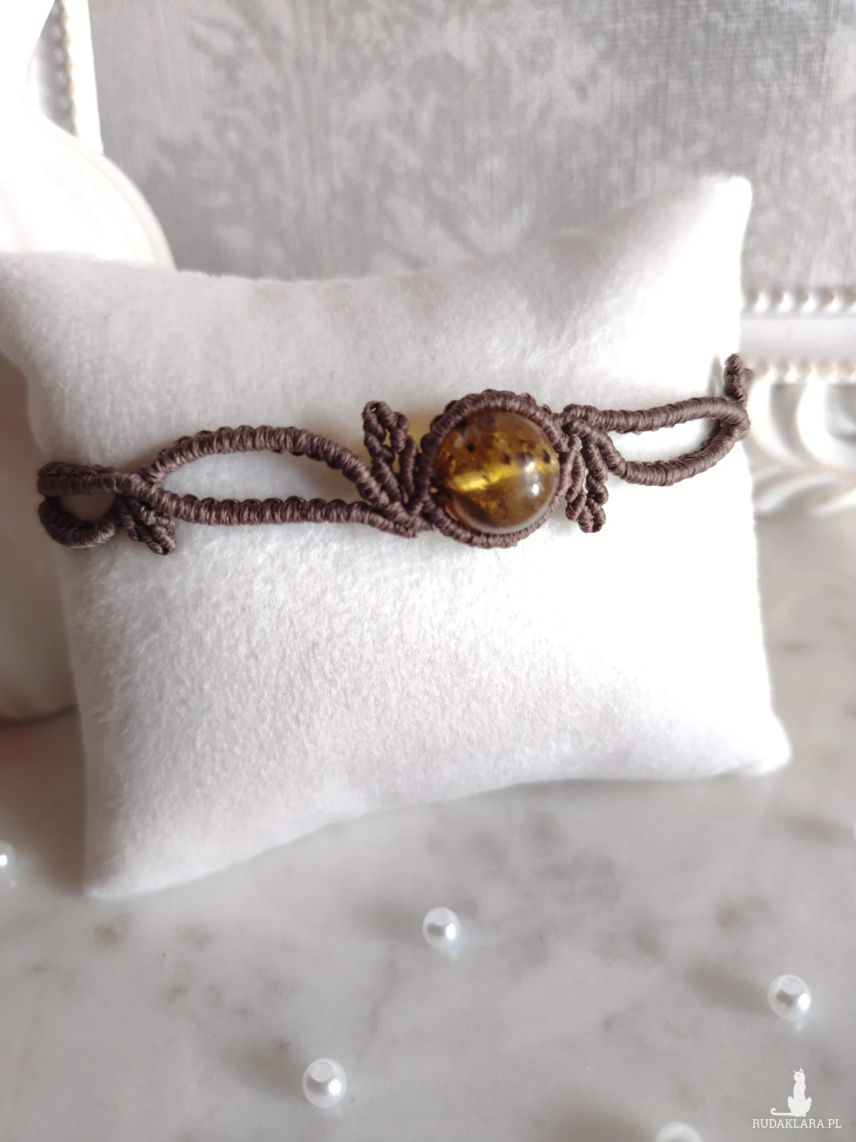 Delikatna, ręcznie wykonana bransoletka w technice mikromakramy, utrzymana w ciepłym odcieniu brązu, który pięknie podkreśla naturalny blask bursztynu. Centralny kamień przyciąga uwagę swoją złocisto-miodową barwą i subtelną grą światła.