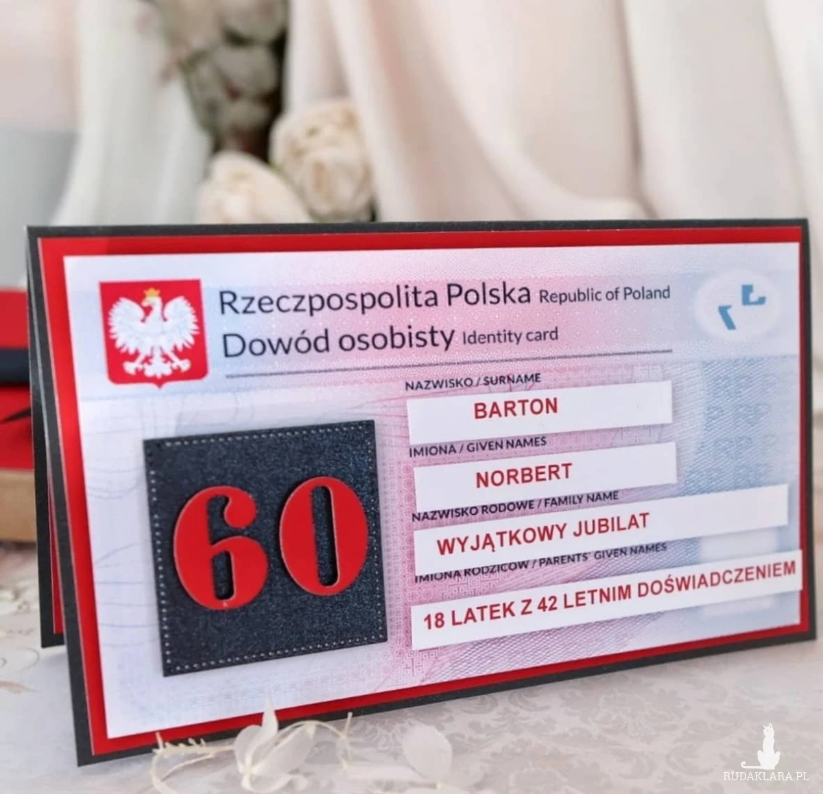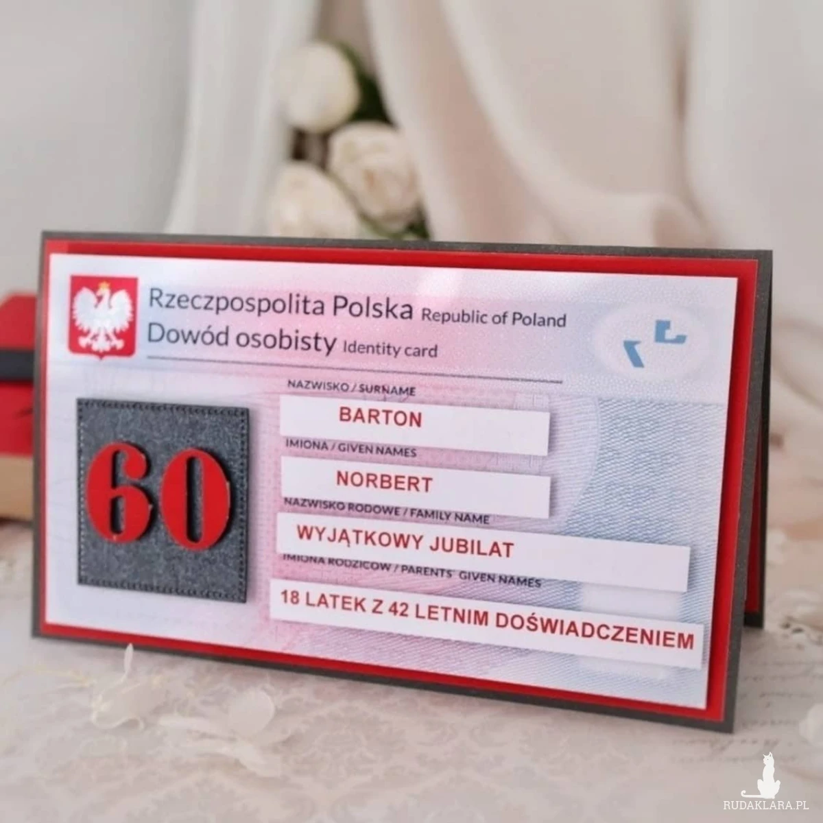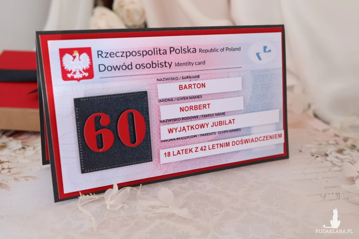 Szukasz prezentu na 60 urodziny dla mężczyzny, który będzie nie tylko zabawny, ale też zapamiętany na długo? Ta ręcznie robiona kartka w formie dowodu osobistego to oryginalny pomysł na prezent, który od razu wywoła uśmiech Jubilata!