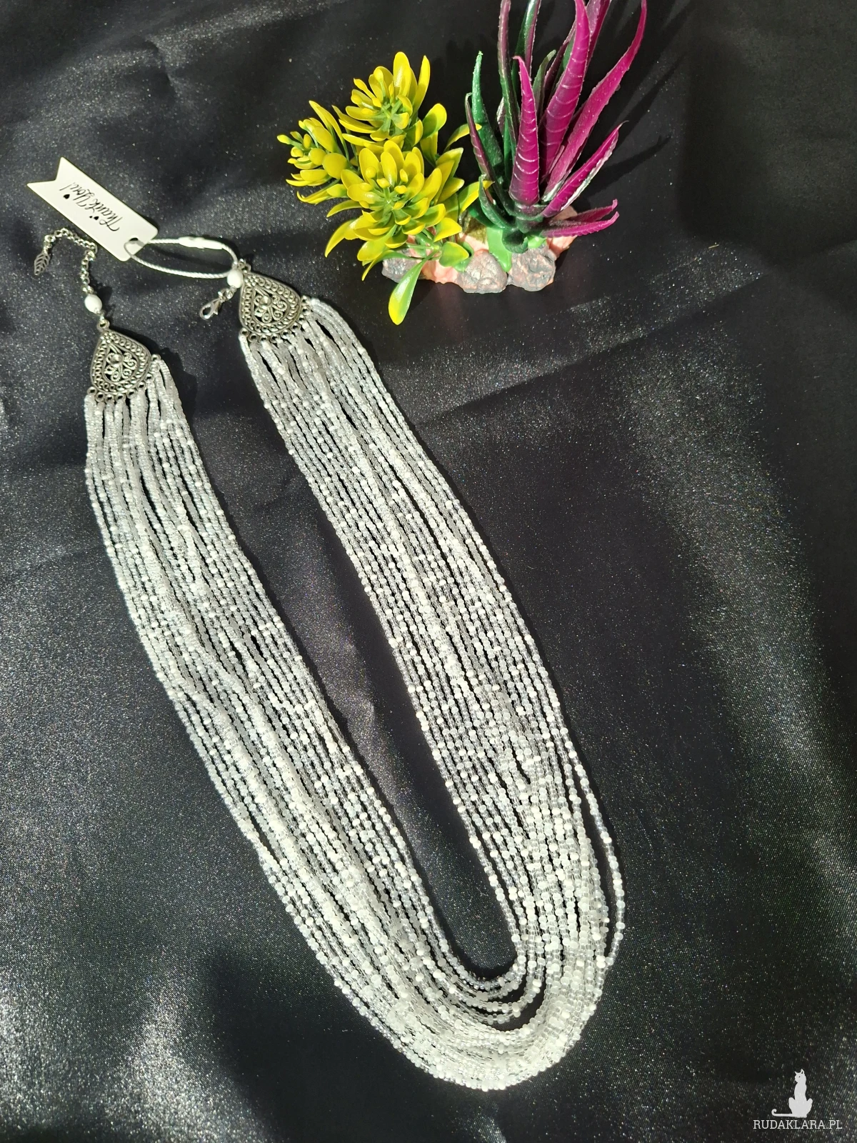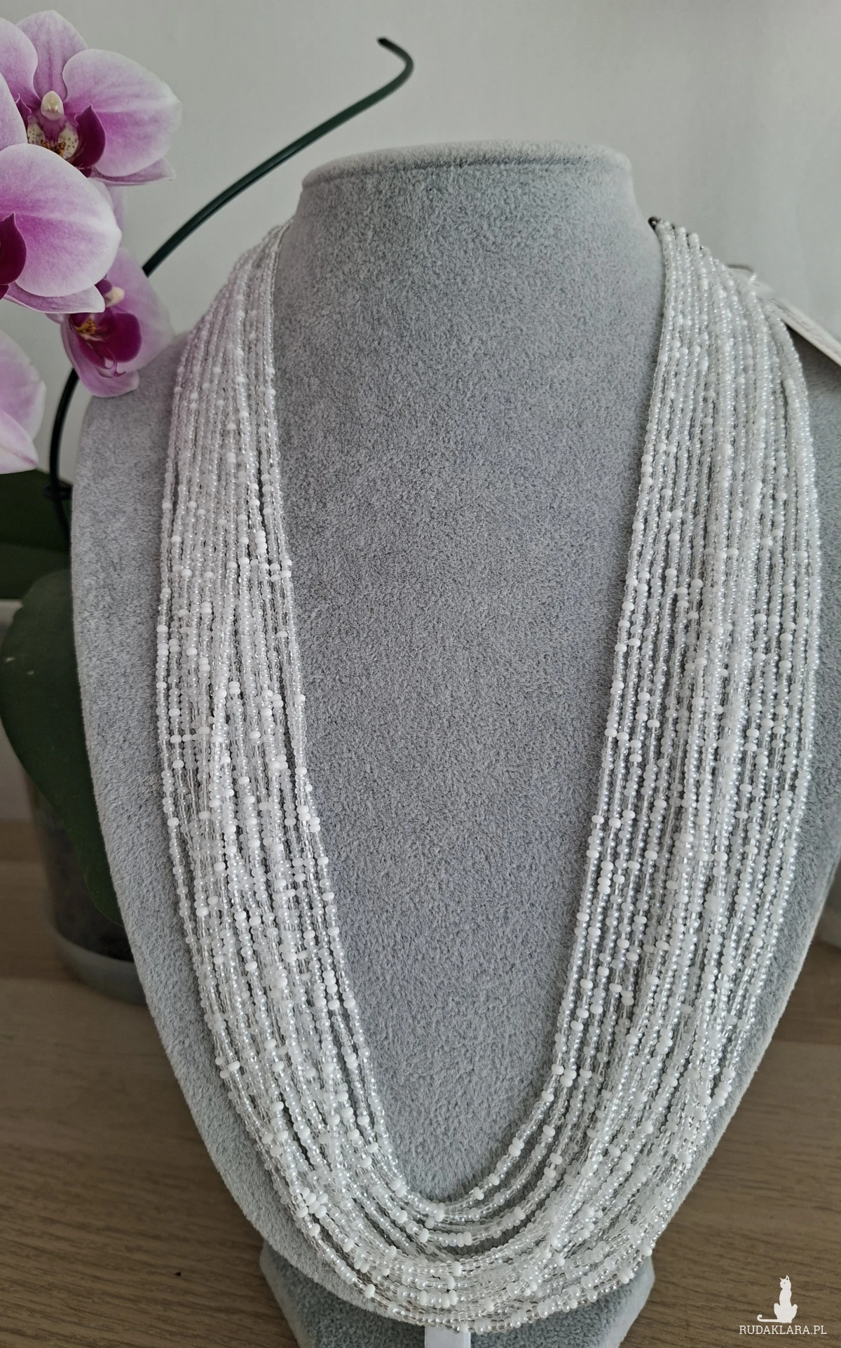 Ten imponujący naszyjnik to kwintesencja elegancji w wydaniu handmade. Skonstruowany z kilkunastu lśniących sznurów drobnych koralików, tworzy efektowną kaskadę, która pięknie rozświetla dekolt i dodaje szyku każdej stylizacji.