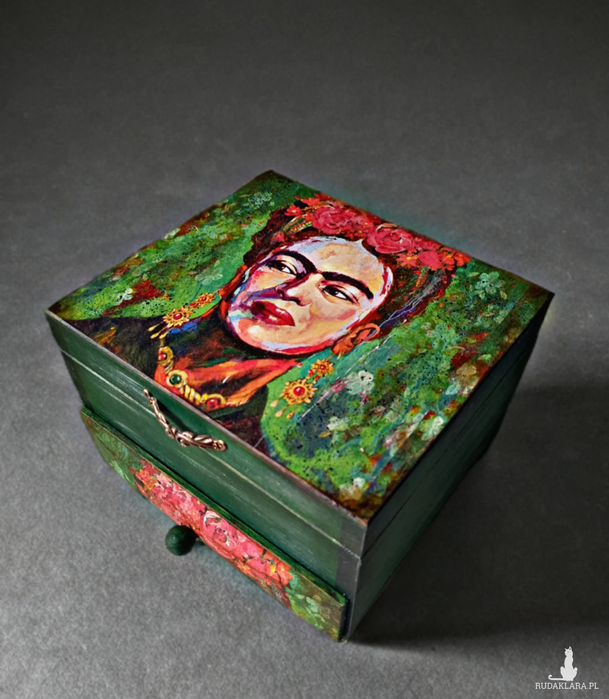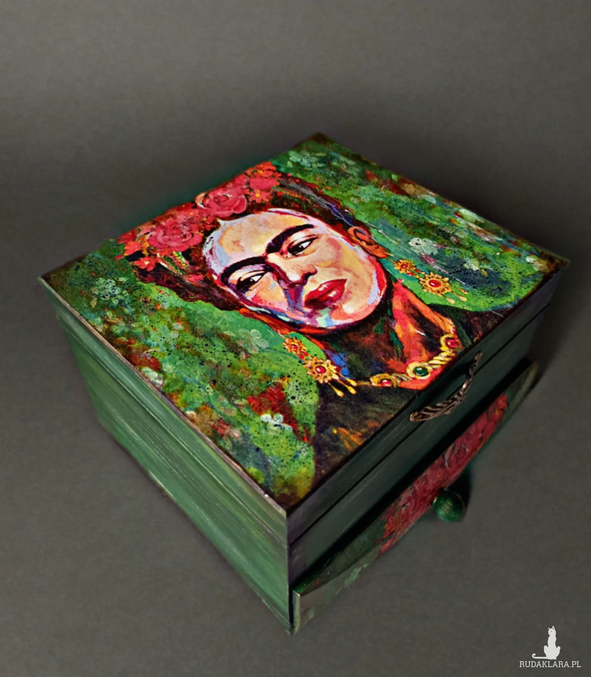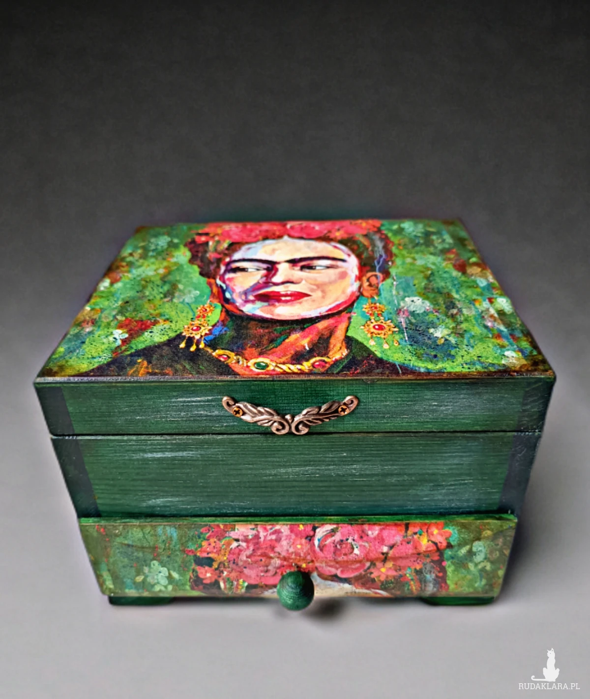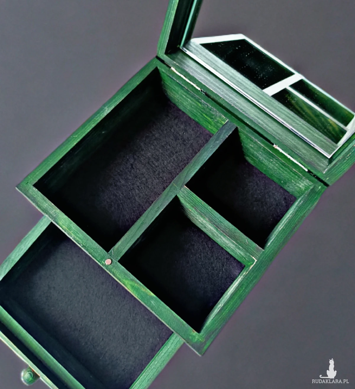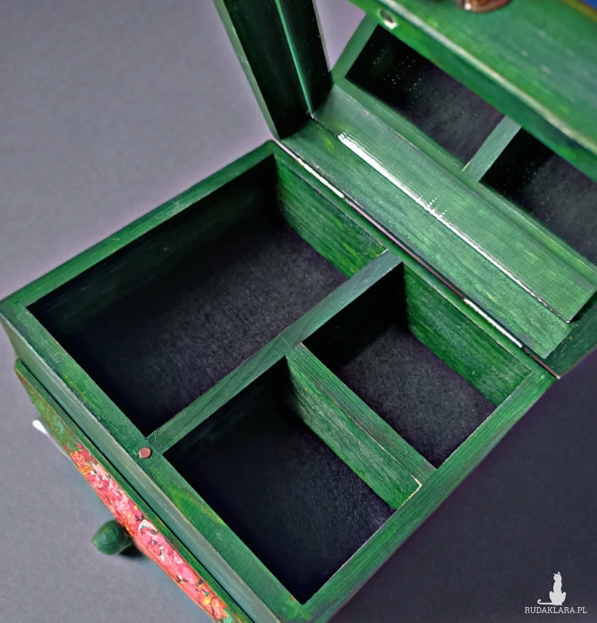 Drewniana skrzyneczka na biżuterię, z przegródkami, dodatkową szufladką i lusterkiem. Zamykana na mały magnesik.