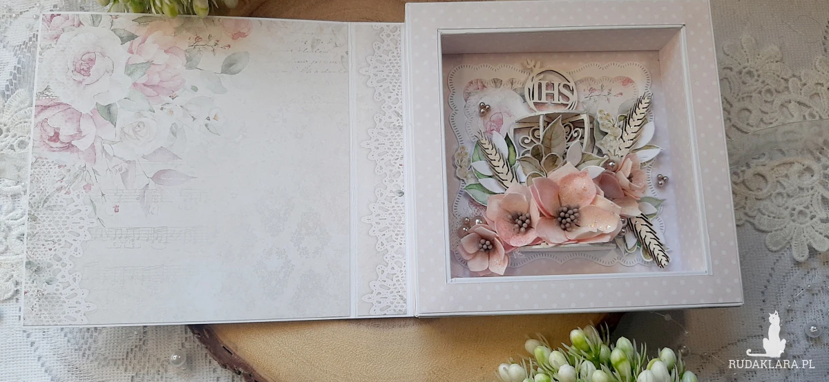 Komunijny Shadow Box dla dziewczynki. W środku kartka podklejona taśmą dwustronną na życzenia, którą można przykleić na wewnętrznej stronie wieczka. Wymiary boxa to 14x14x2,5 cm. Będzie nietuzinkowym prezentem i fajną pamiątką.