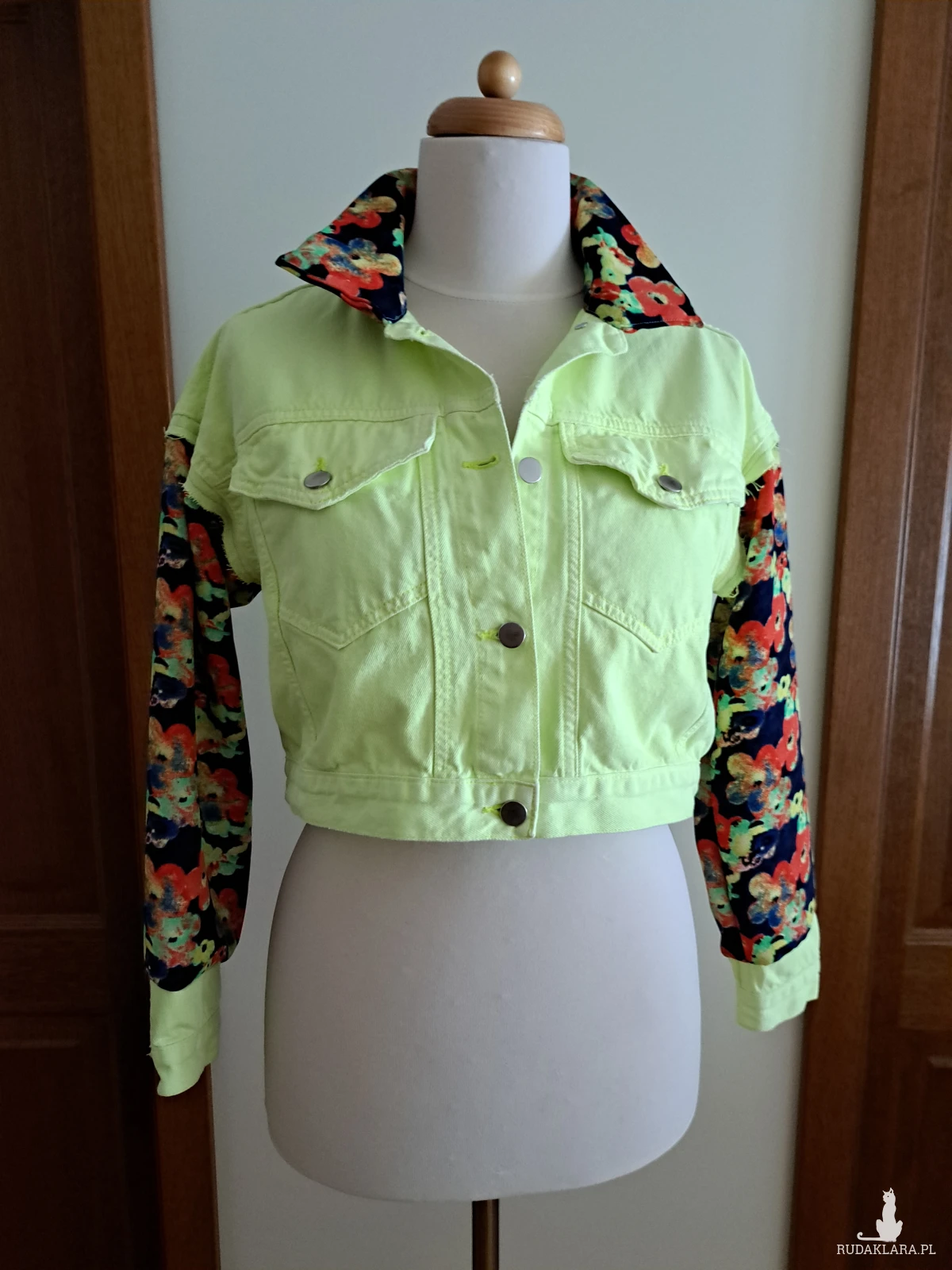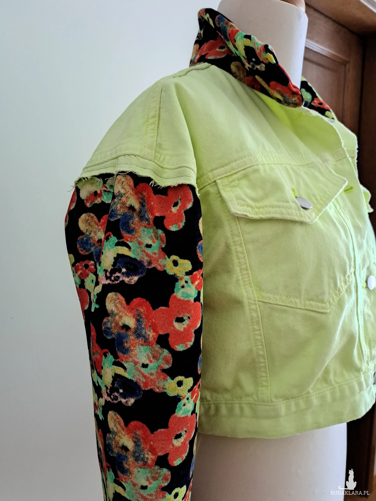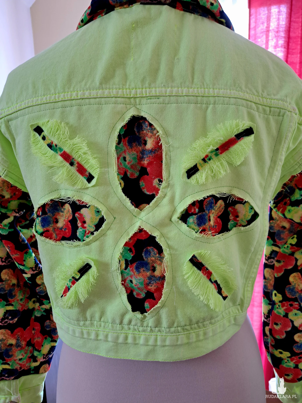 Sprzedam kolejne moje dzieło z serii nic nie może być nudne!!! Krótka jaskrawa kurtka z misterny wyciętym kwiatem, z dodatkiem super dobranej tkaniny i na rekawach i kołnierzu.Wszystko 100 % mój projekt,jedyna! . Piękna i unikatowa na każdą okazję!!!. Bardzo polecam! Długość 41 między pachami 2x50 POLECAM jedyna taka dla Ciebie 🙂 DAJĘ RZECZOM DRUGIE ŻYCIE