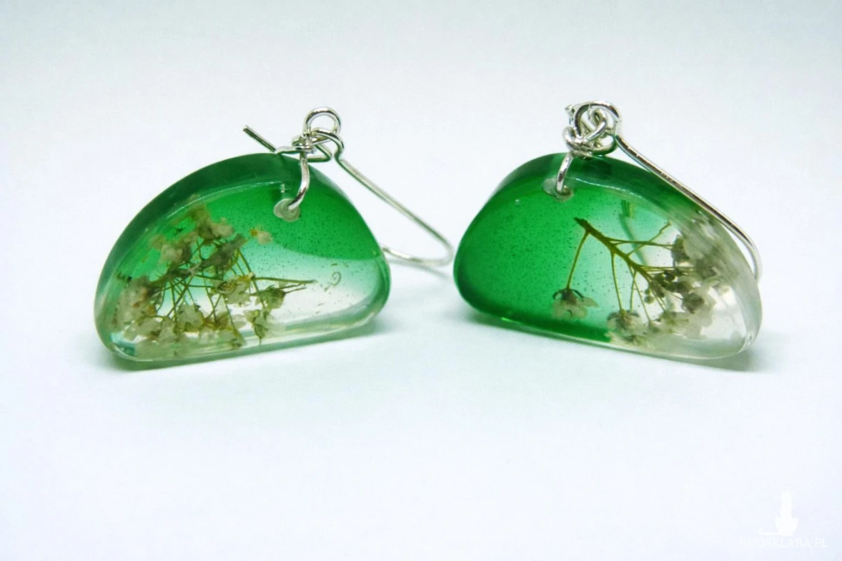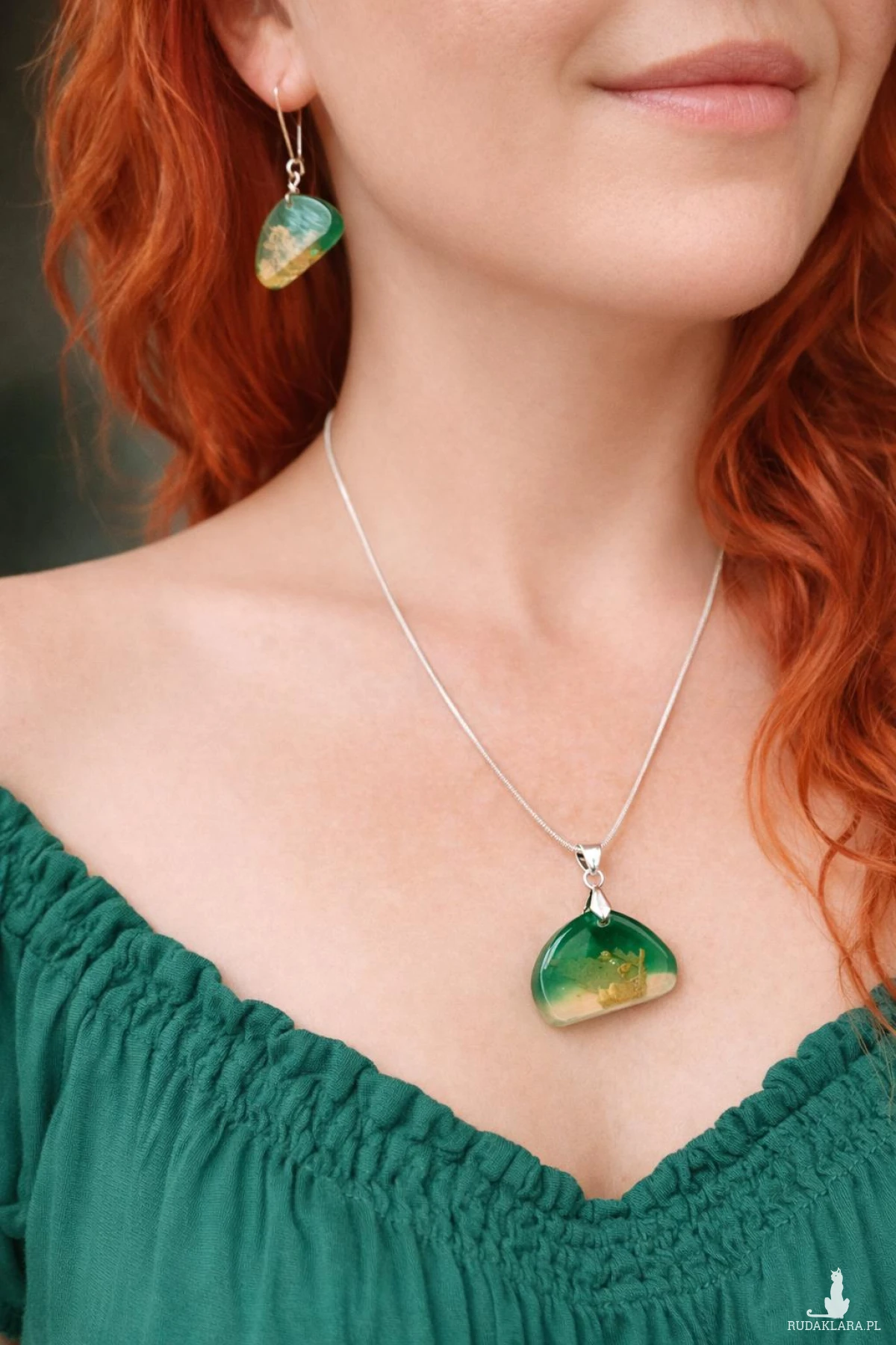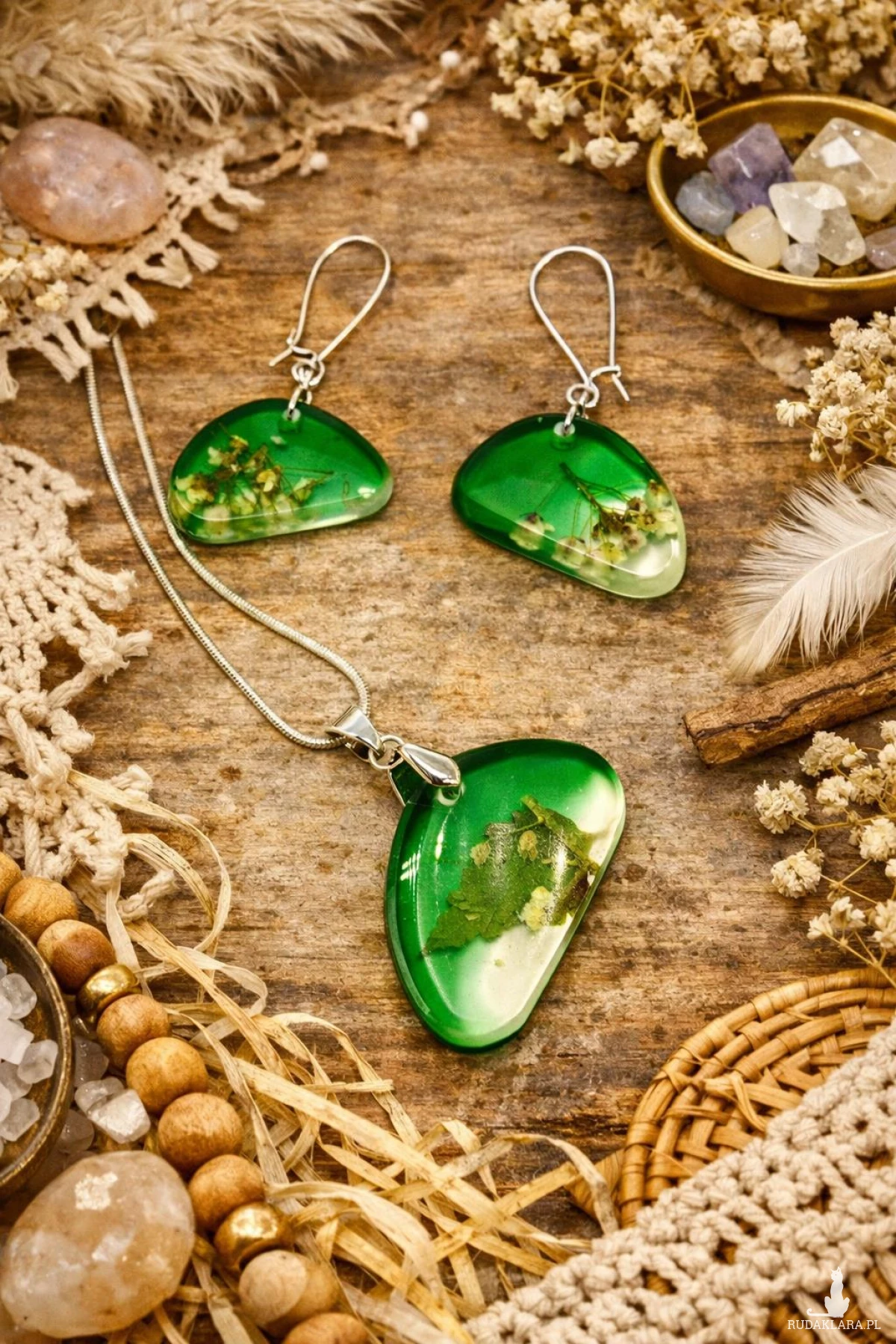 Wyjątkowy komplet biżuterii handmade wykonany z transparentnej zielonej żywicy epoksydowej, w której zostały zatopione prawdziwe liście pokrzywy. Każdy zestaw tworzony jest ręcznie, dzięki czemu stanowi niepowtarzalną ozdobę inspirowaną naturą.