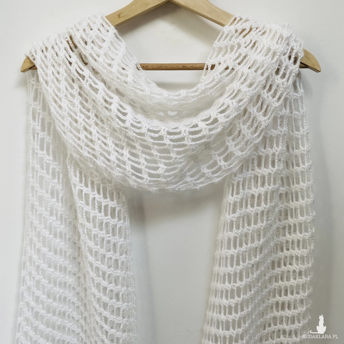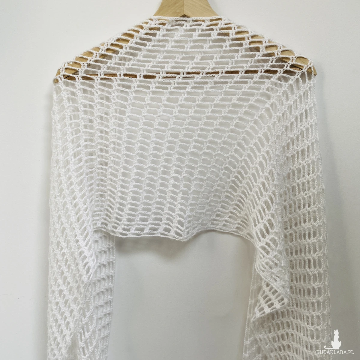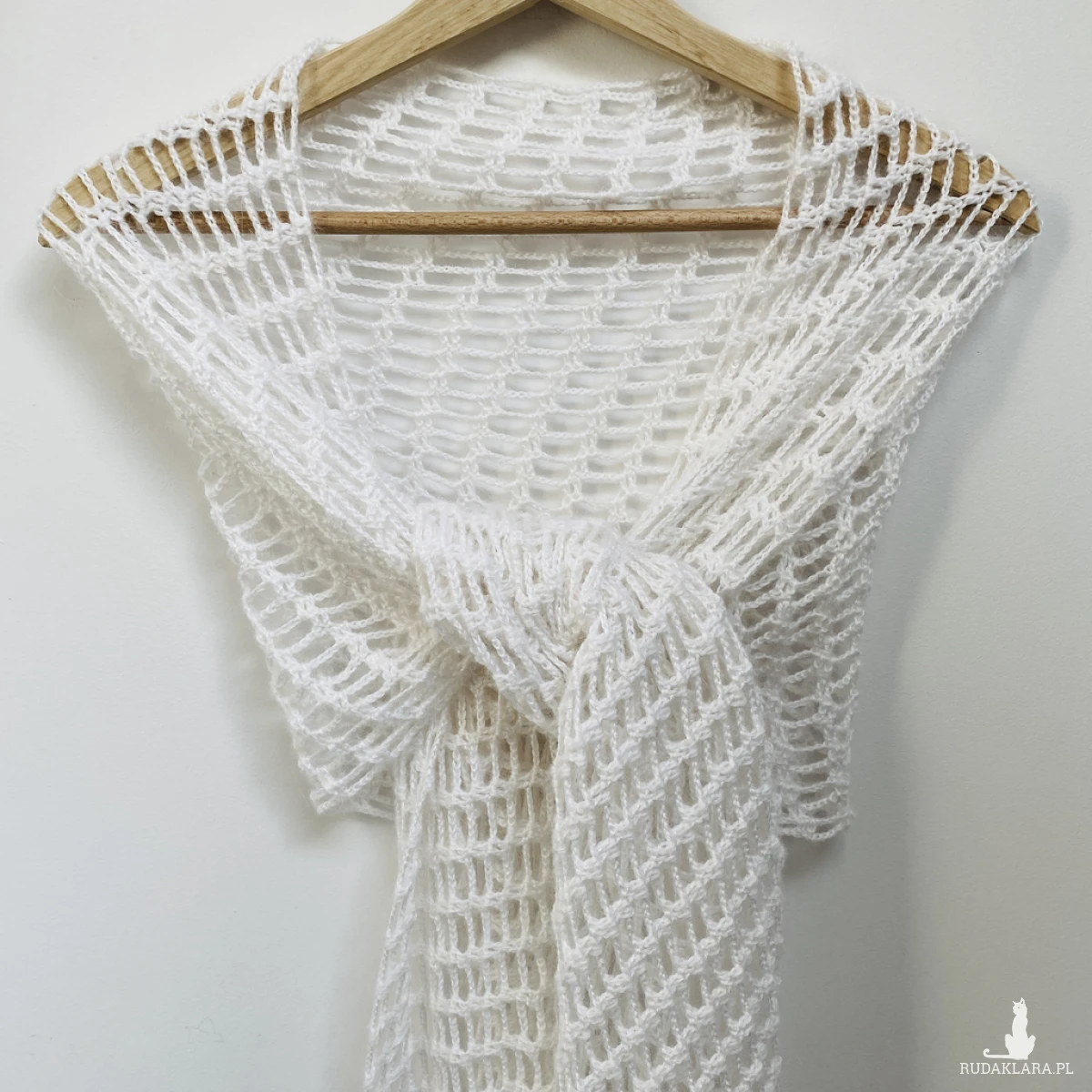 Elegancki, lekki szal ślubny wykonany ręcznie na szydełku z wysokiej jakości, miękkiej włóczki z delikatnym włoskiem Papatya Angora z certyfikatem OEKO-TEX® Standard 100. Klasyczny biały kolor sprawia, że etola idealnie pasuje do sukni ślubnej, ale sprawdzi się także po uroczystości jako subtelny dodatek do eleganckich i codziennych stylizacji.