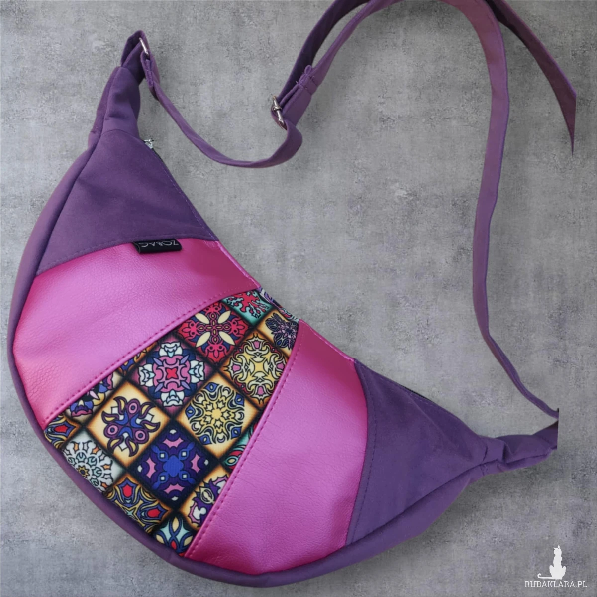 Uszyta z fioletowego weluru oraz printu wodoodpornego i ekoskóry, w środku czarna podszewka. Pasek z weluru o szerokości 3cm.