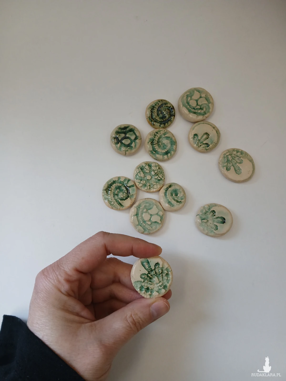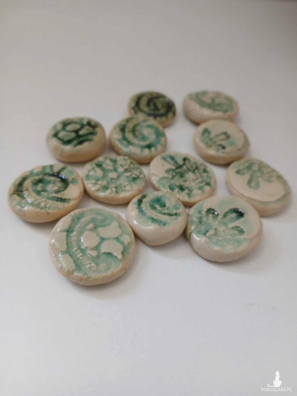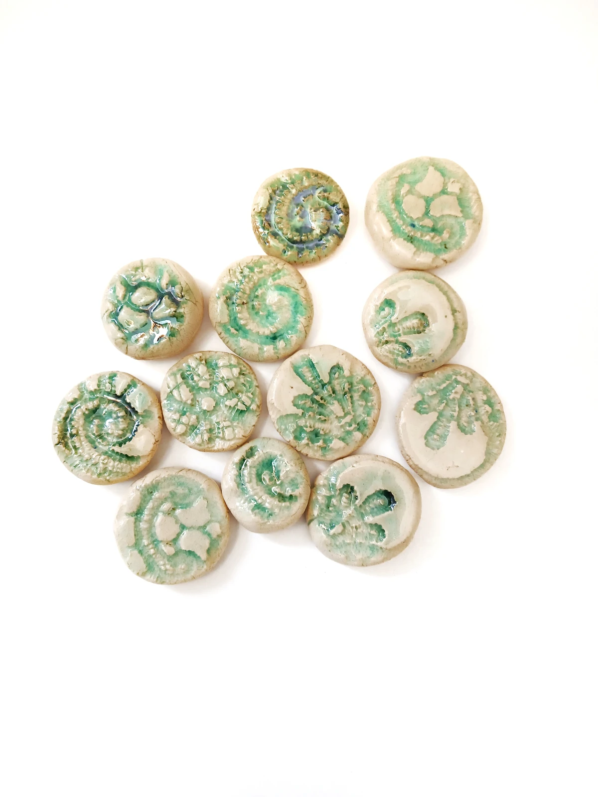 Ceramiczne kamyki dekoracyjne z odciśniętym wzorem skamieliny skamieniałości. Można użyć do dekoracji akwarium czy ogrodu lub jako element do tworzenia biżuterii, można je oprawić lub przykleić do zapięcia do broszki. Naklejone na deskę stworzą niezwykłą mozaikę lub mandalę.