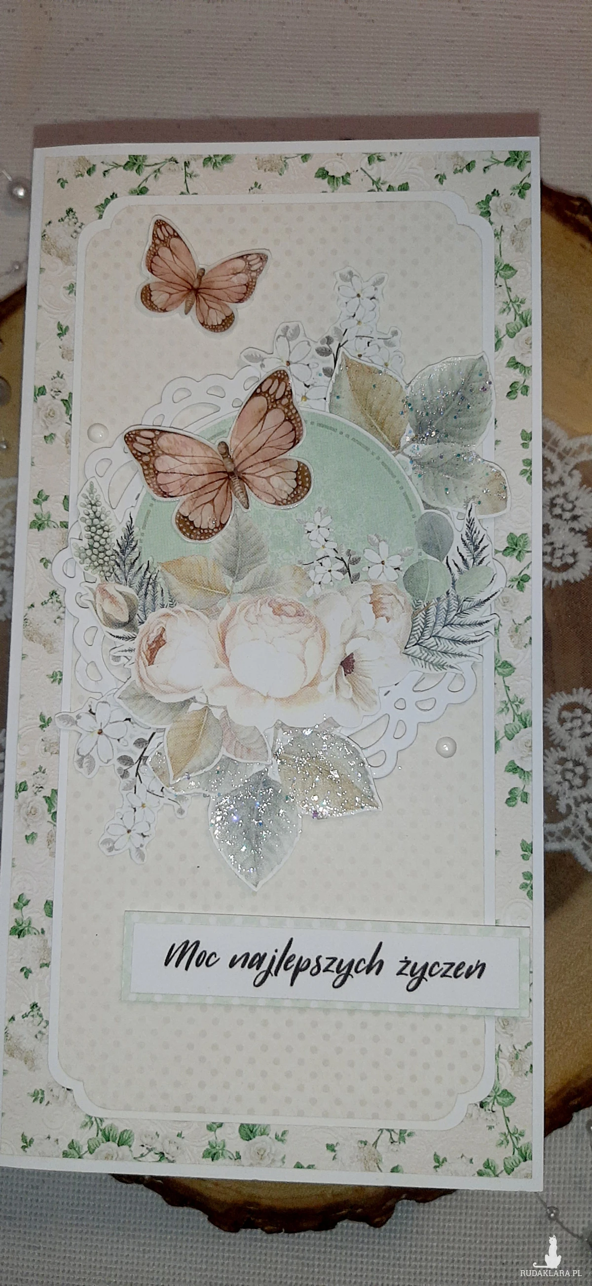 Kartka okolicznościowa, ręcznie wykonana metodą scrapbooking. Kartka do koperty. Oklejona z każdej strony. W środku znajduje się kartka podklejona taśmą dwustronną na życzenia. Mogę też wydrukować życzenia. Wymiary kartki to 20,5x10,5 cm. W zestawie z kopertą.
