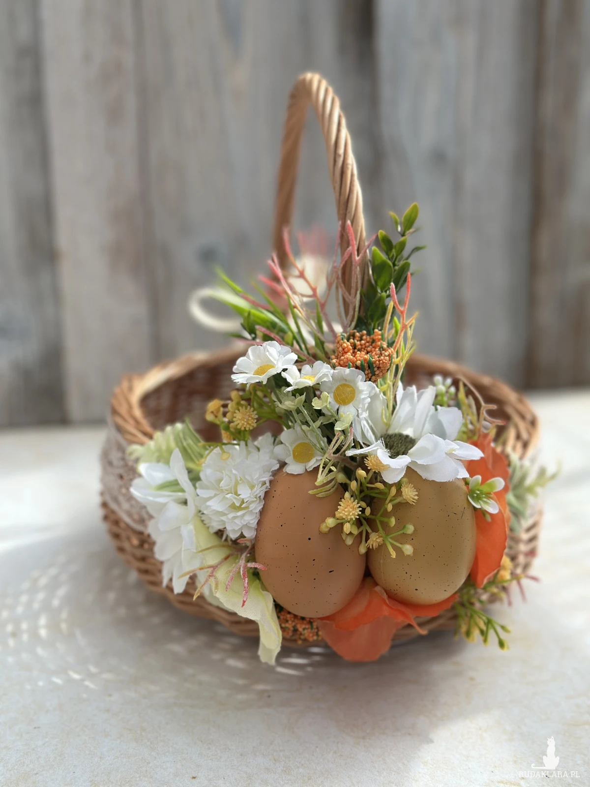 Koszyczek wielkanocny z naturalnej wikliny, ozdobiony kwiatami i dodatkami sztucznymi. Dekoracja na stałe przymocowana do koszyczka, przygotowana przeze mnie ręcznie :)