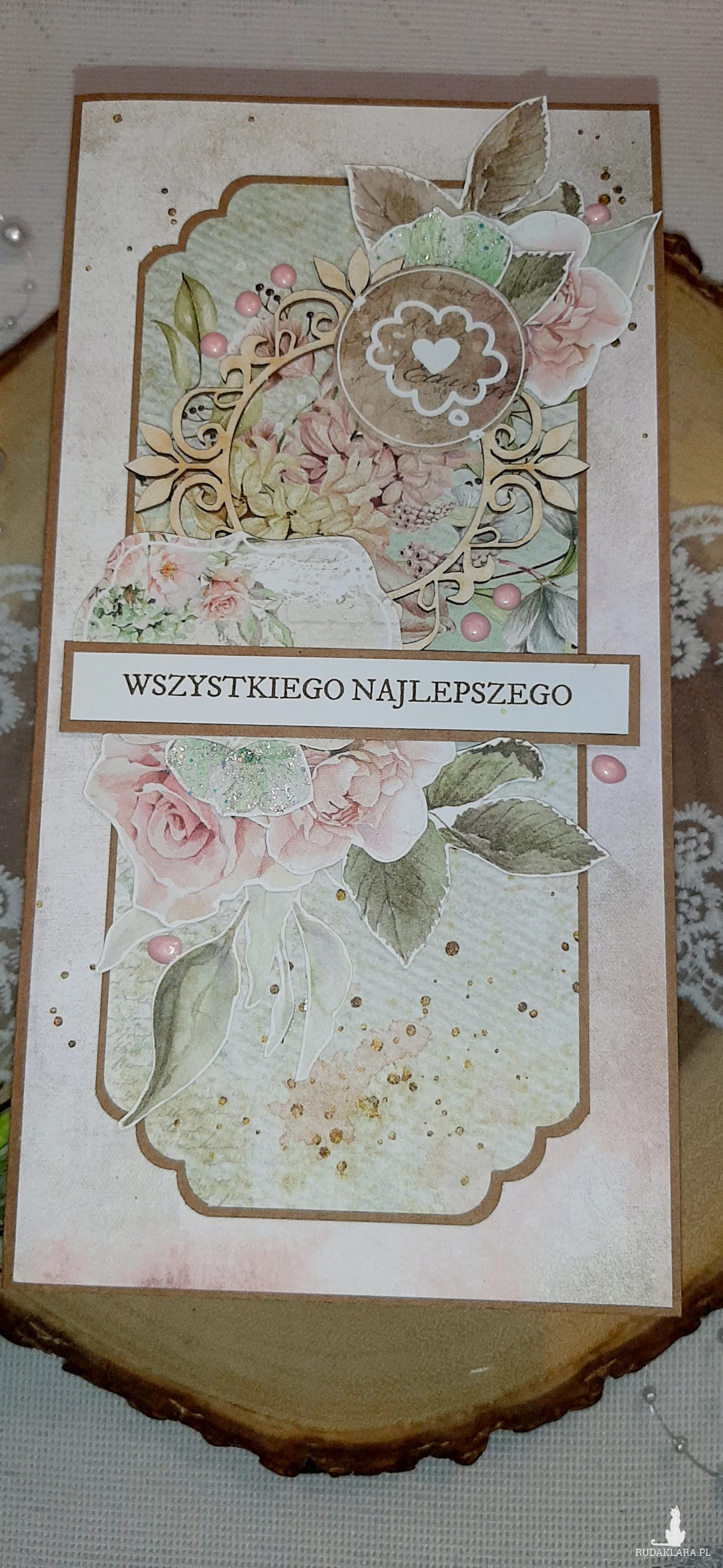Kartka okolicznościowa, ręcznie wykonana metodą scrapbooking na bazie kraftowej. Kartka do koperty. Oklejona z każdej strony. W środku znajduje się kartka podklejona taśmą dwustronną na życzenia. Mogę też wydrukować życzenia. Wymiary kartki to 20,5x10,5 cm. W zestawie z kopertą kraftową.